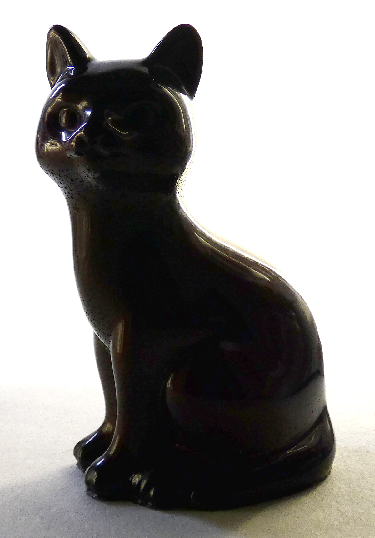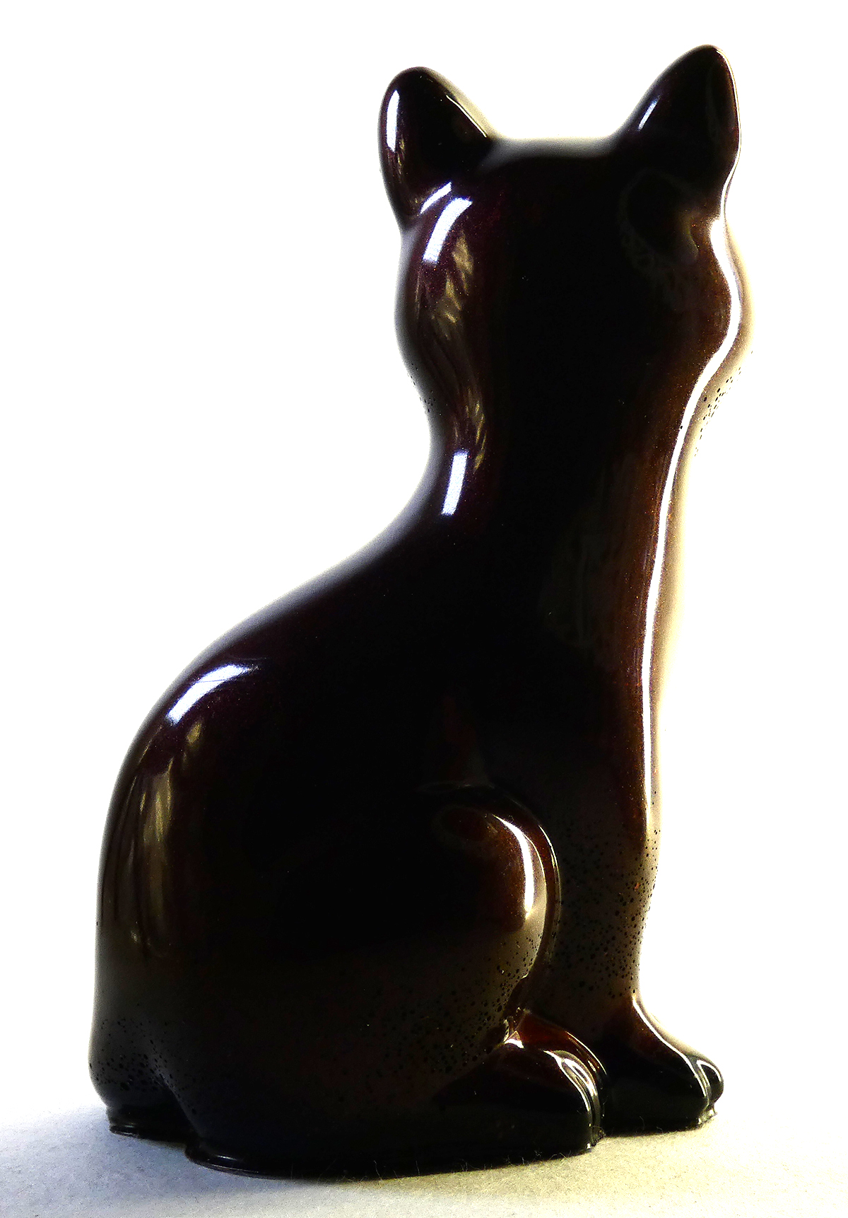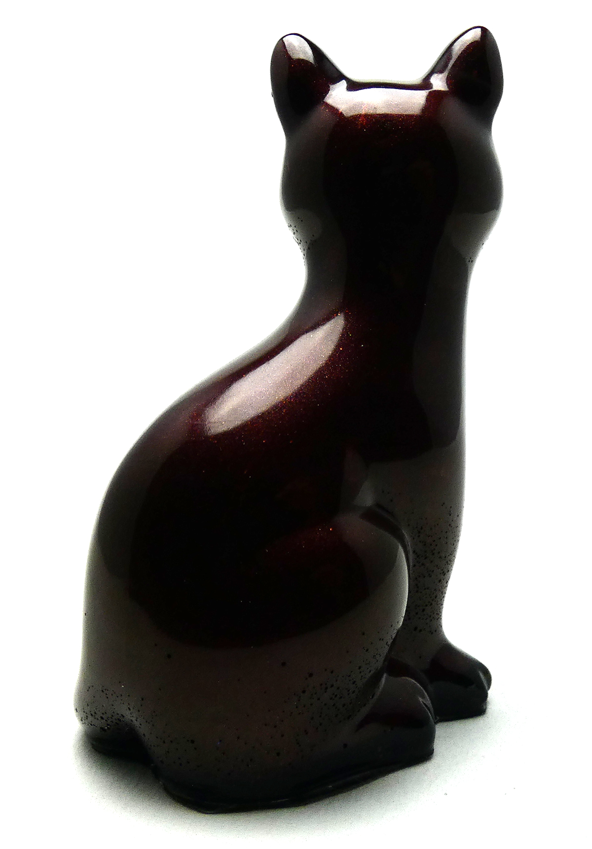 Kattenbeeldje van epoxy hars. De epoxy is gemengd met chocolade bruine mica poeder. Dit geeft deze kat een diepbruine licht glinsterend effect. De onderkant is afgewerkt met zwarte epoxy.