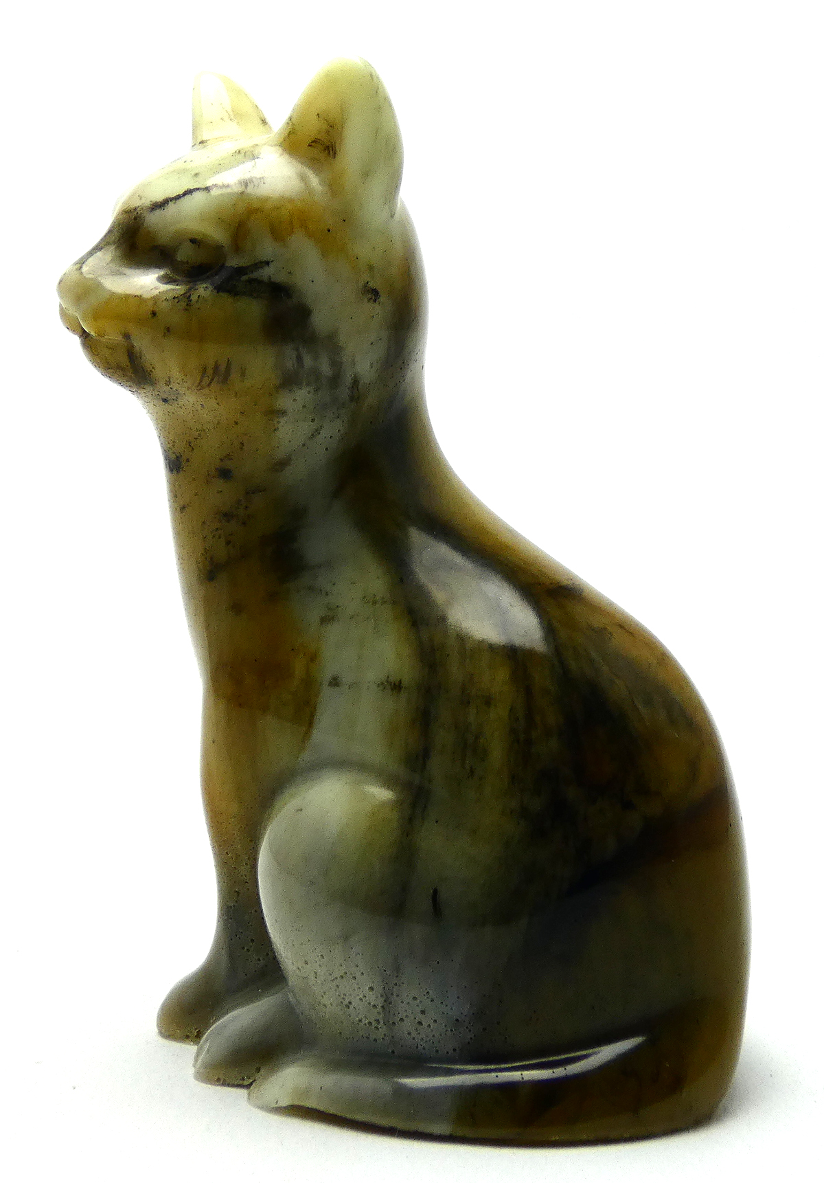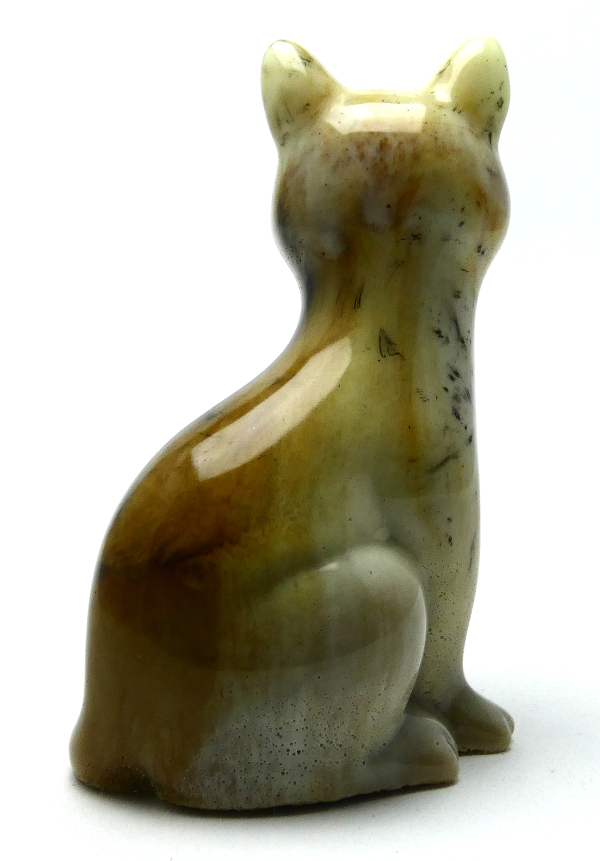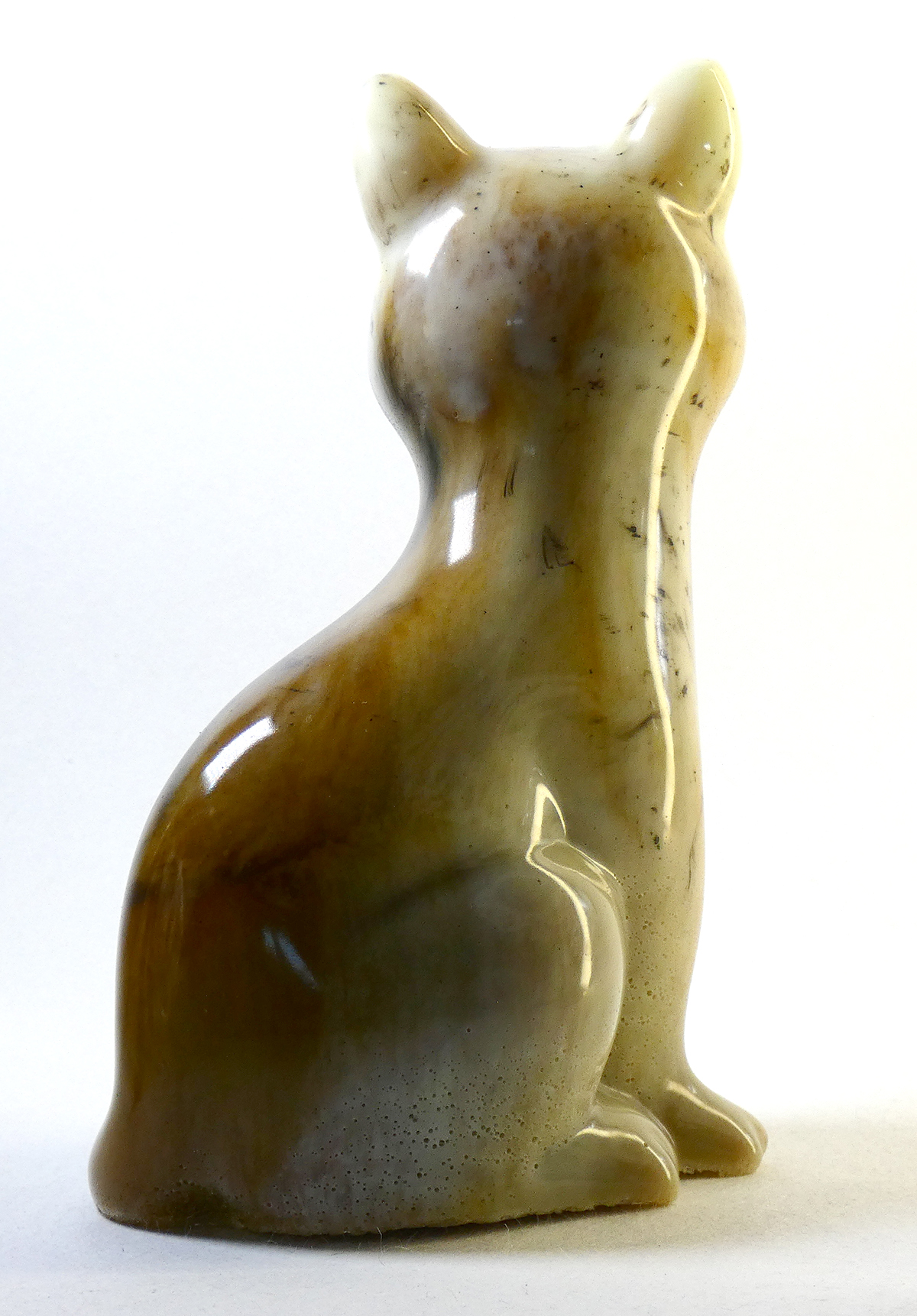Kattenbeeldje van epoxy hars. De epoxy is gemengd met crème glow in the dark, lichtbruin en zwart. Deze kat heeft ook een soort marmer effect. De crème kleur is fluorescerend (glow in the dark) als je het beeldje in het donker plaatst, dan veranderd het in een lichtgevende jade groene kleur. Om dit effect te zien moet het beeldje een tijdje in het licht staan en dan kan je het fluorescerend effect zien als het interieur donker is.