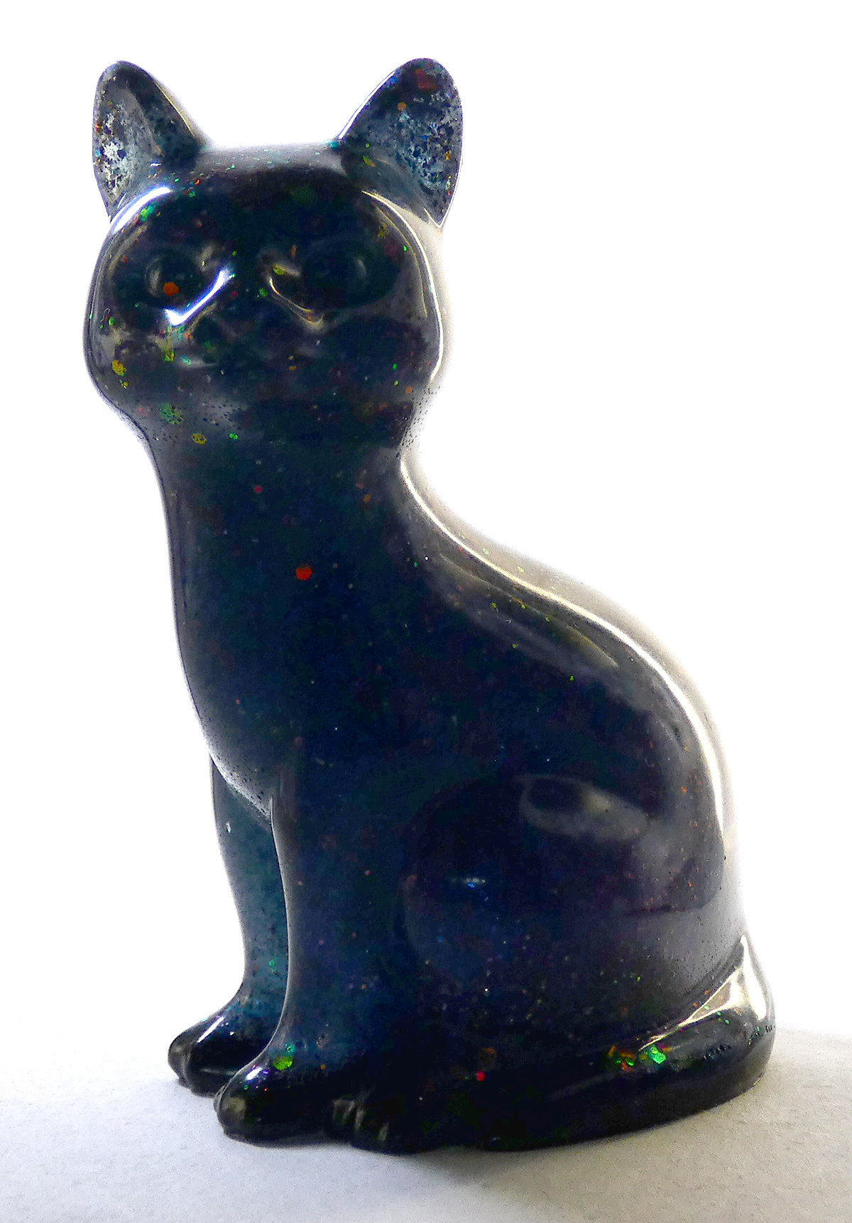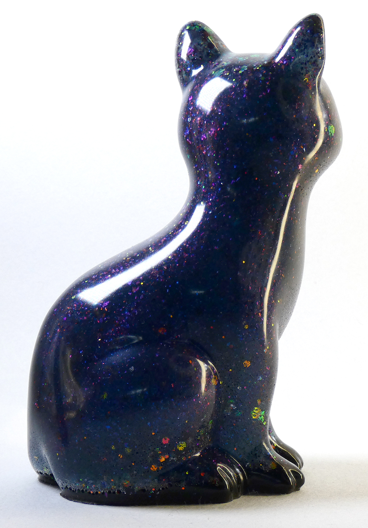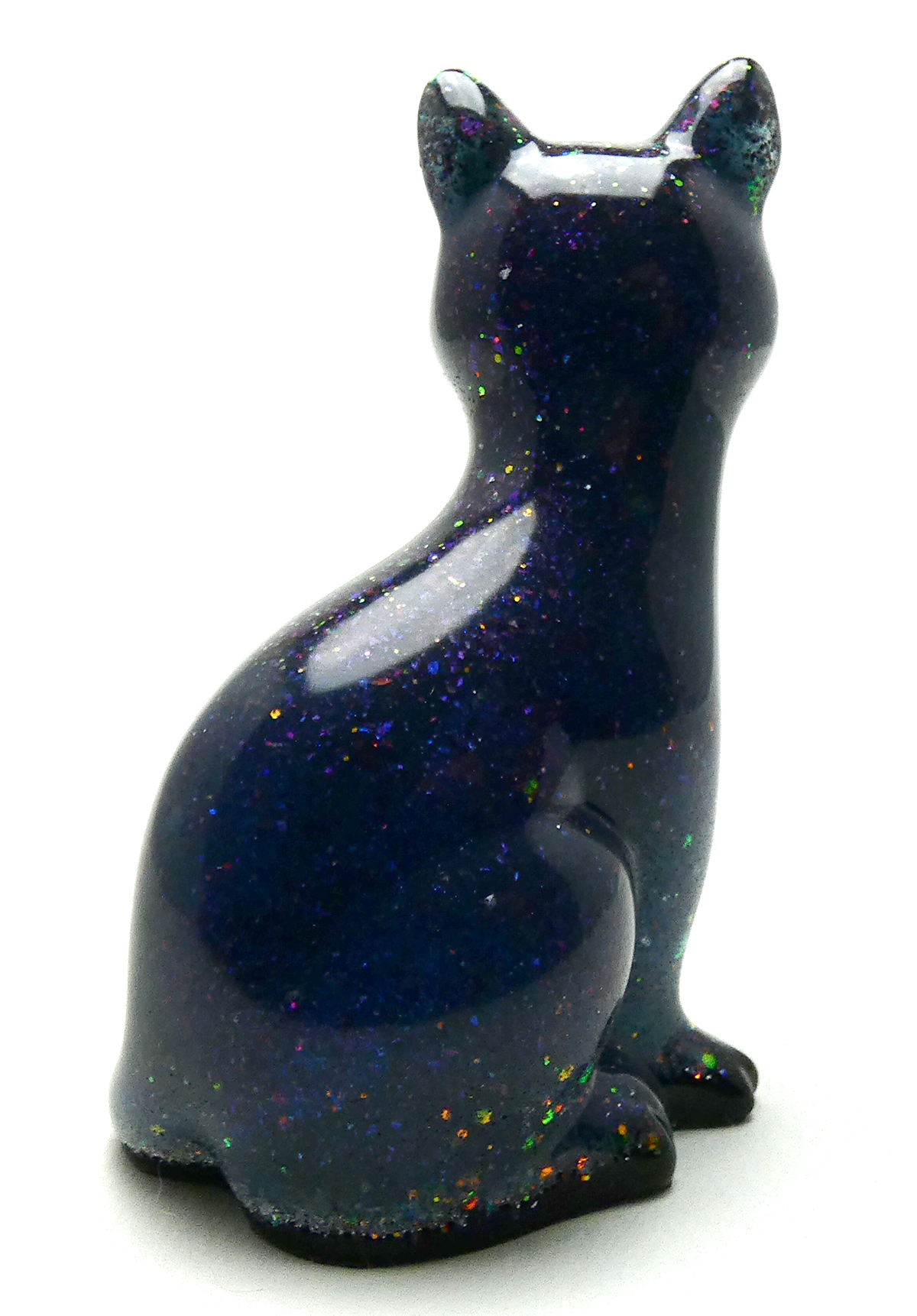 Kattenbeeldje van epoxy hars. De epoxy is gemengd met diepblauwe mica poeder en glitters. Deze kat heeft een kosmisch galaxy effect. De onderkant is afgewerkt met zwarte epoxy.