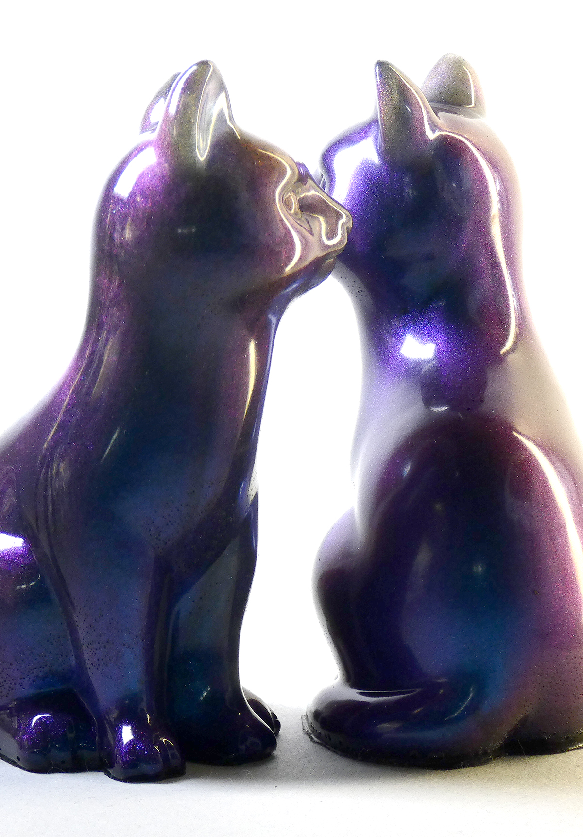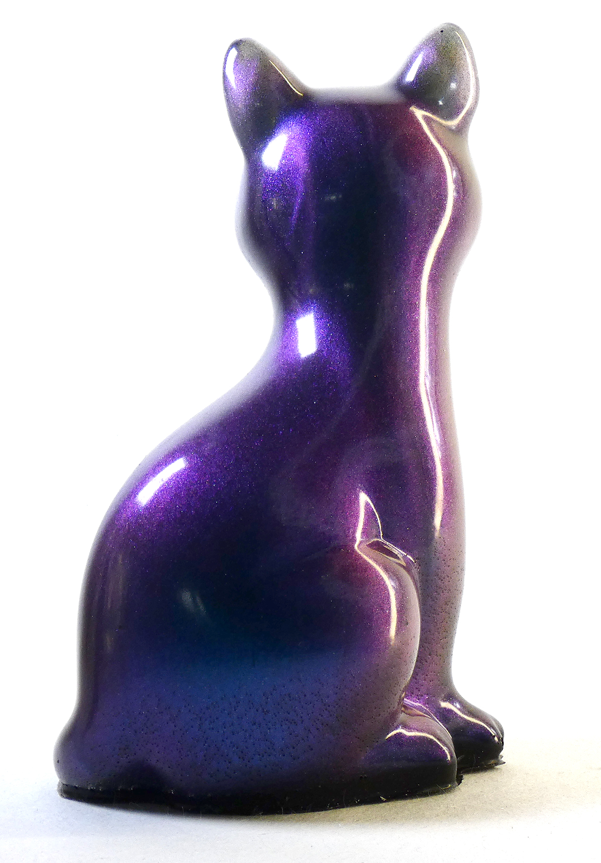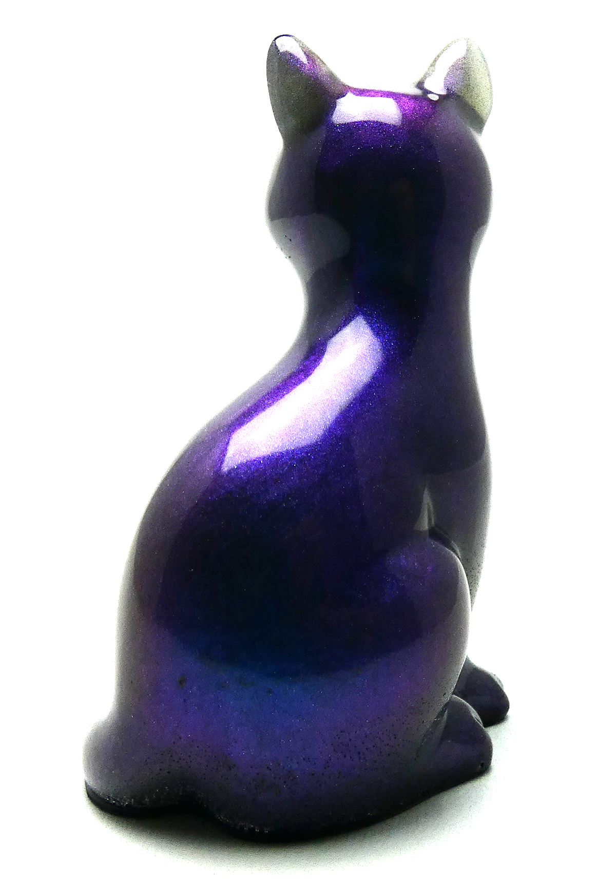 Kattenbeeldje van epoxy hars. De epoxy is gemengd met donkerblauwe en paarse mica poeder. Afhankelijk van hoe het licht op deze kat schijnt en de kijkhoek, verschuiven de kleuren paars en blauw door het glinsterende interference mica poeder. De onderkant is afgewerkt met zwarte epoxy.