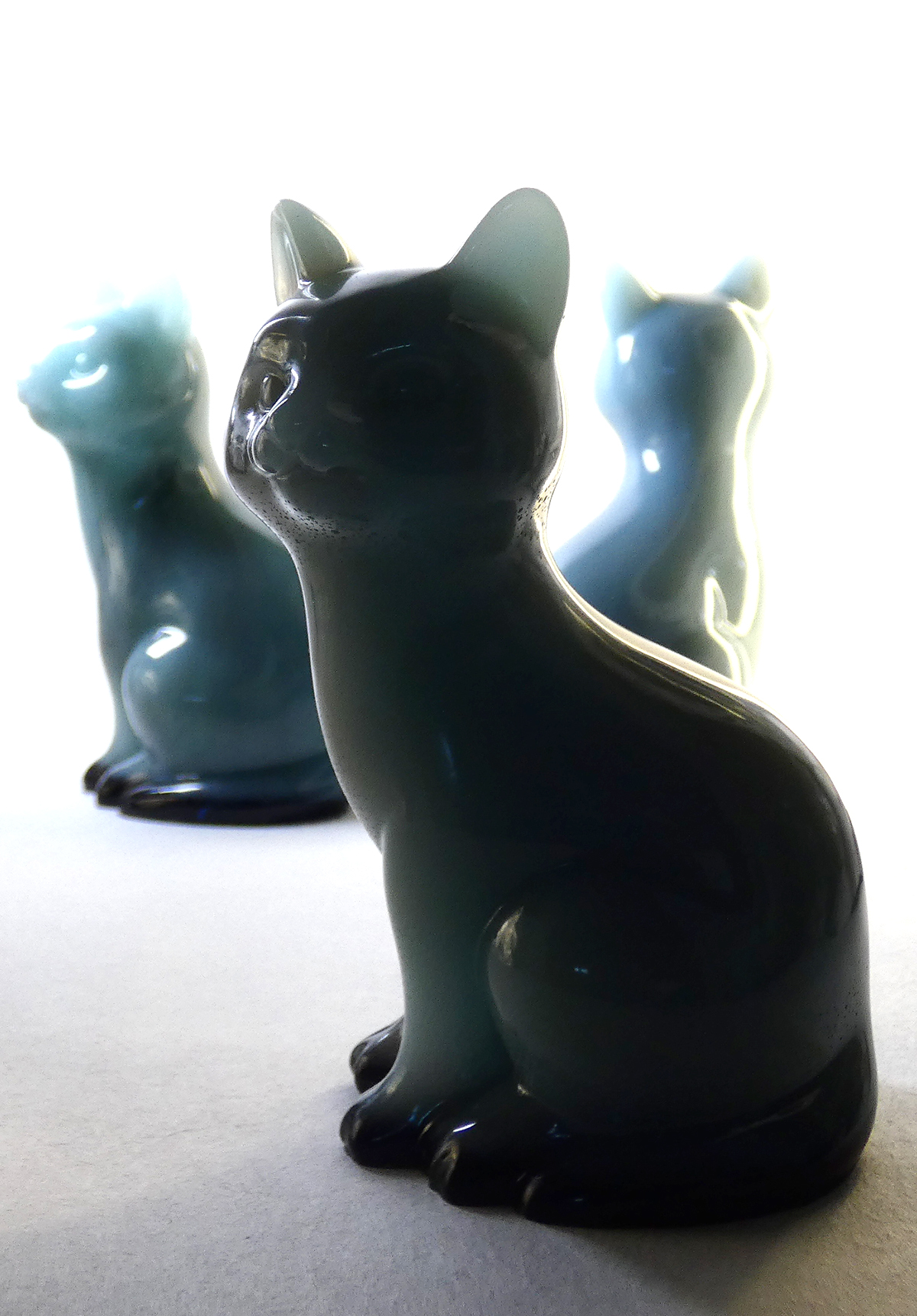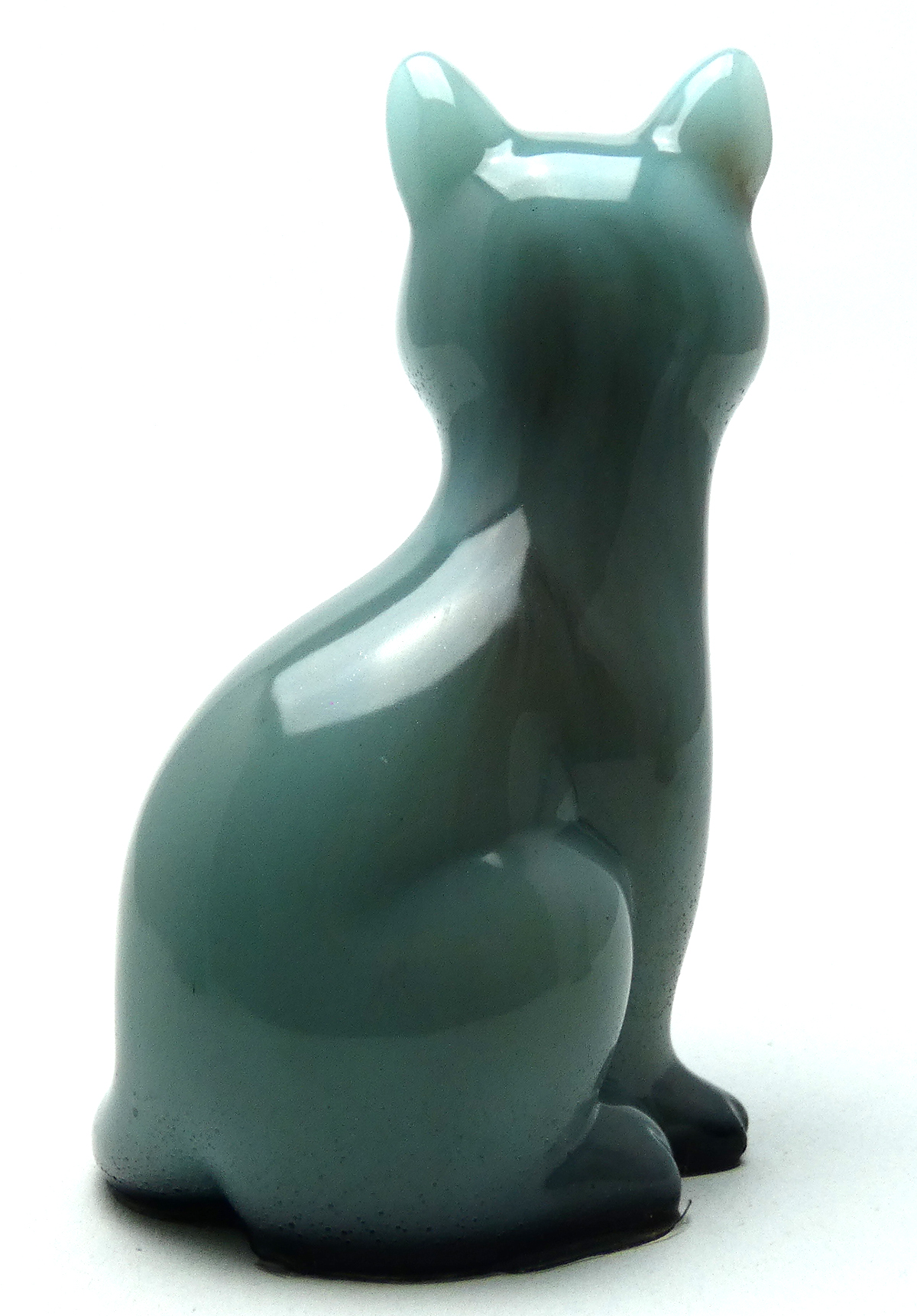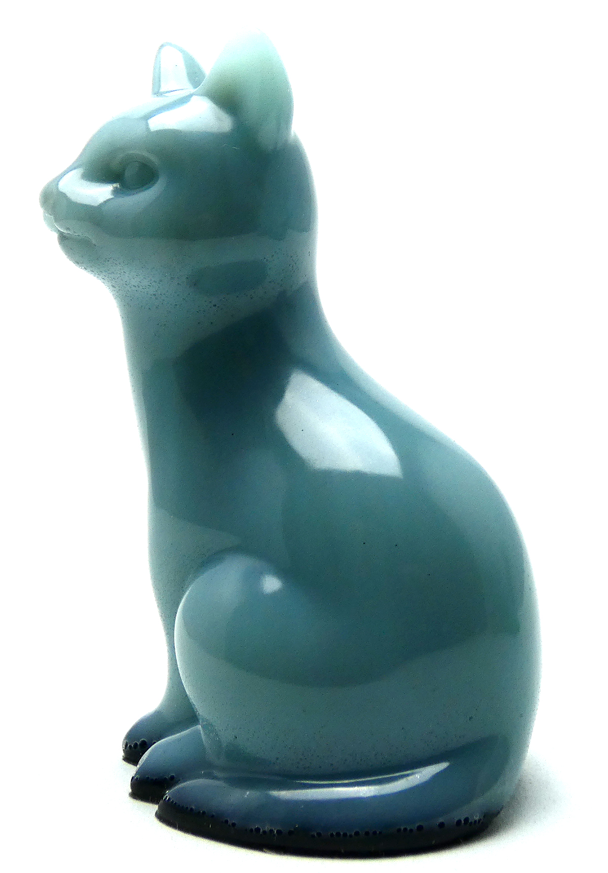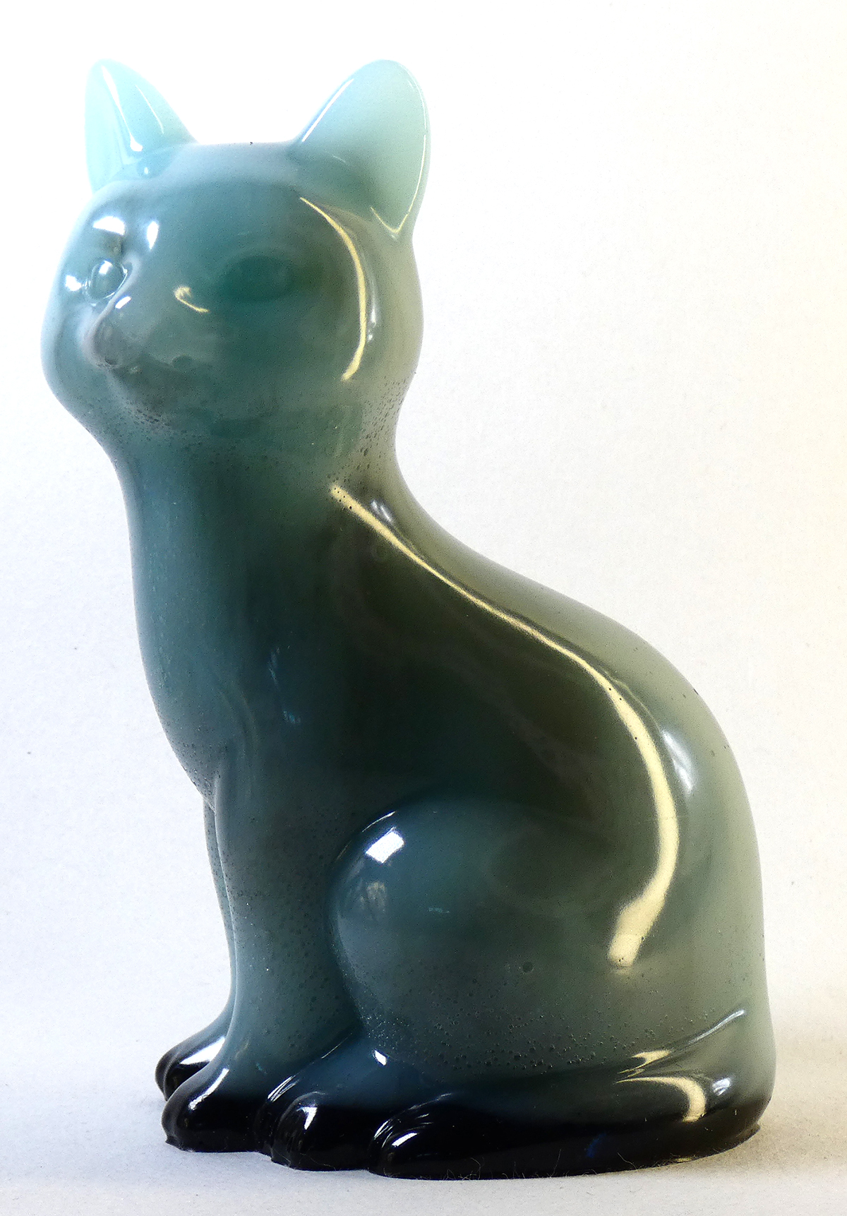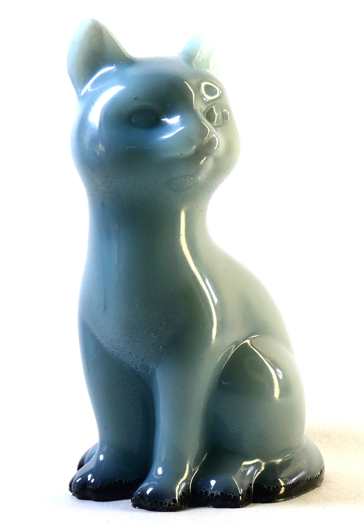 Kattenbeeldje van epoxy hars. De epoxy is gemengd met een grijsblauwe kleur en een vleugje zwart. De onderkant is afgewerkt met zwarte epoxy.