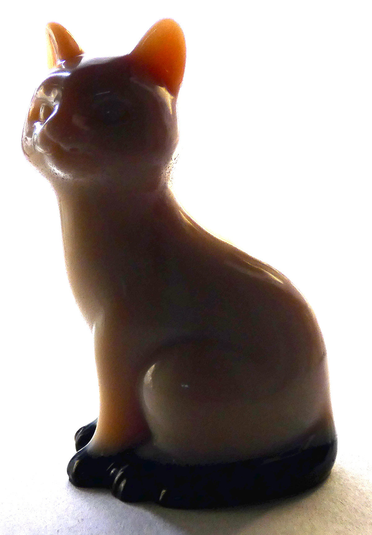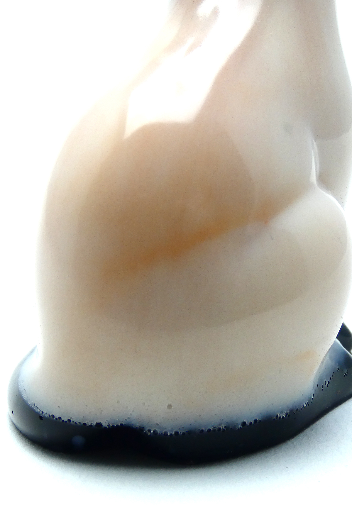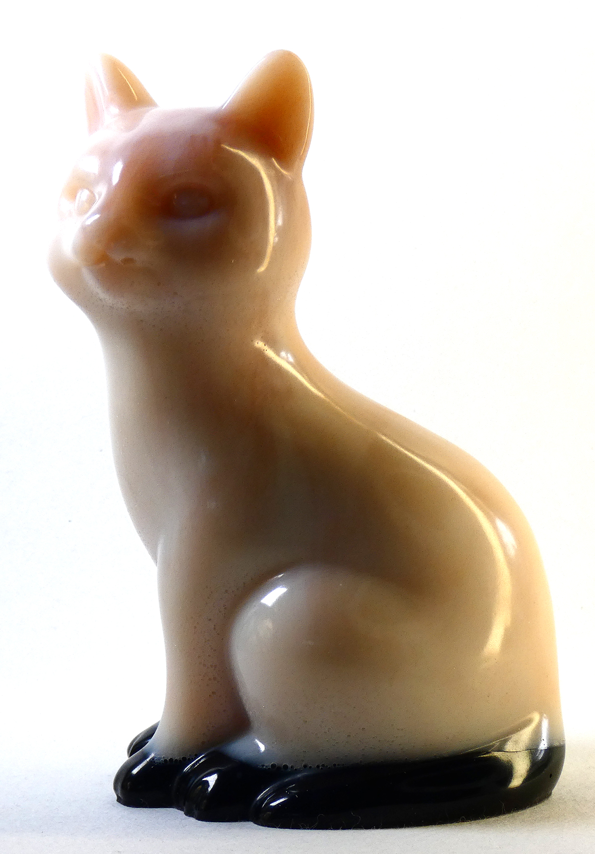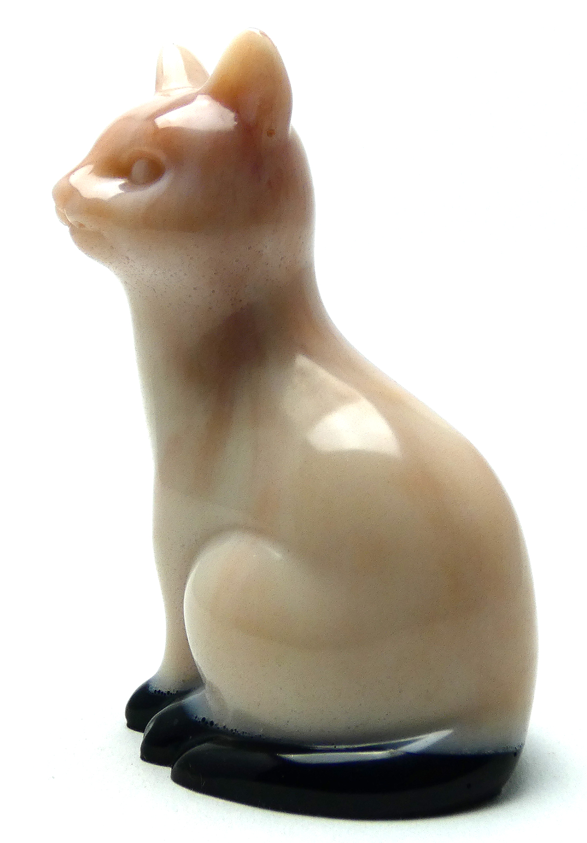 Kattenbeeldje van epoxy hars. De epoxy is gemengd met ovaal ivoorwit en een vleugje oudroze. Omdat er verder geen effecten zijn toegepast heeft deze kat een klassieke uitstraling. De onderkant is afgewerkt met zwarte epoxy. Uiteraard is dit geen echt ivoor maar een ivoor kleur.