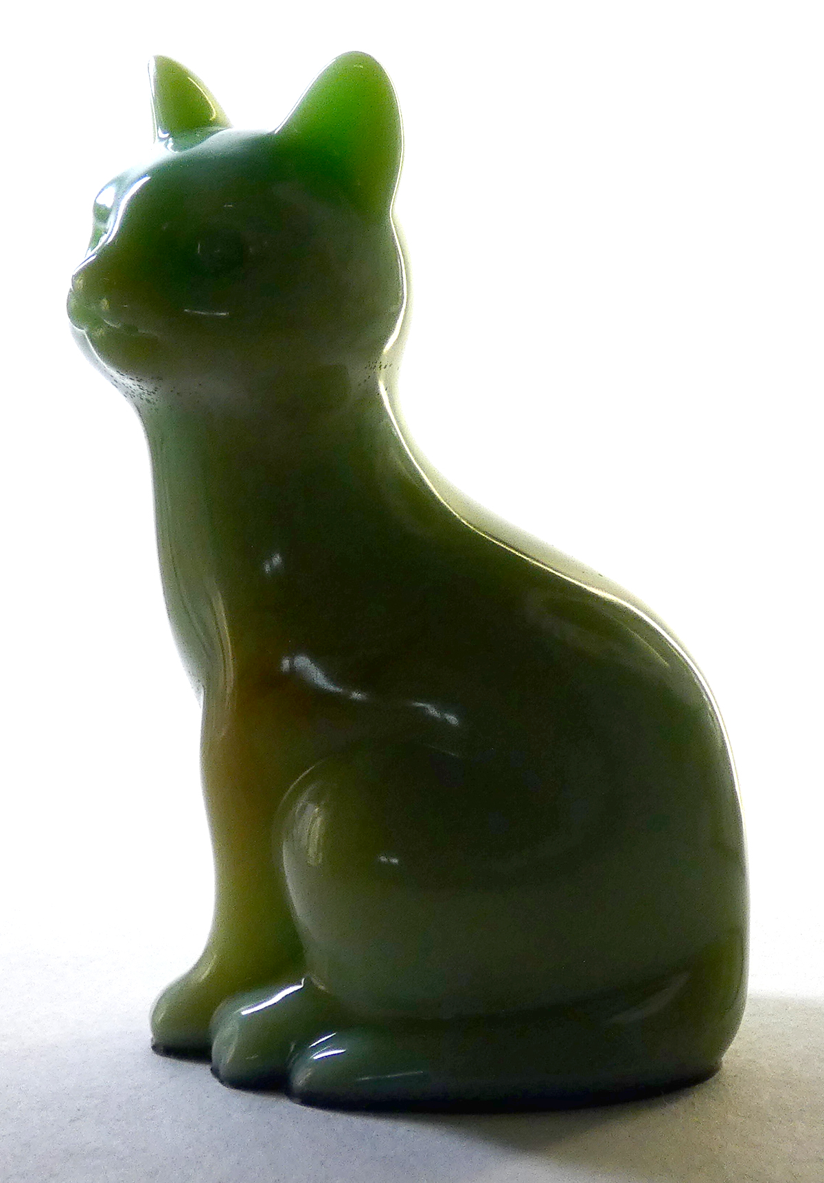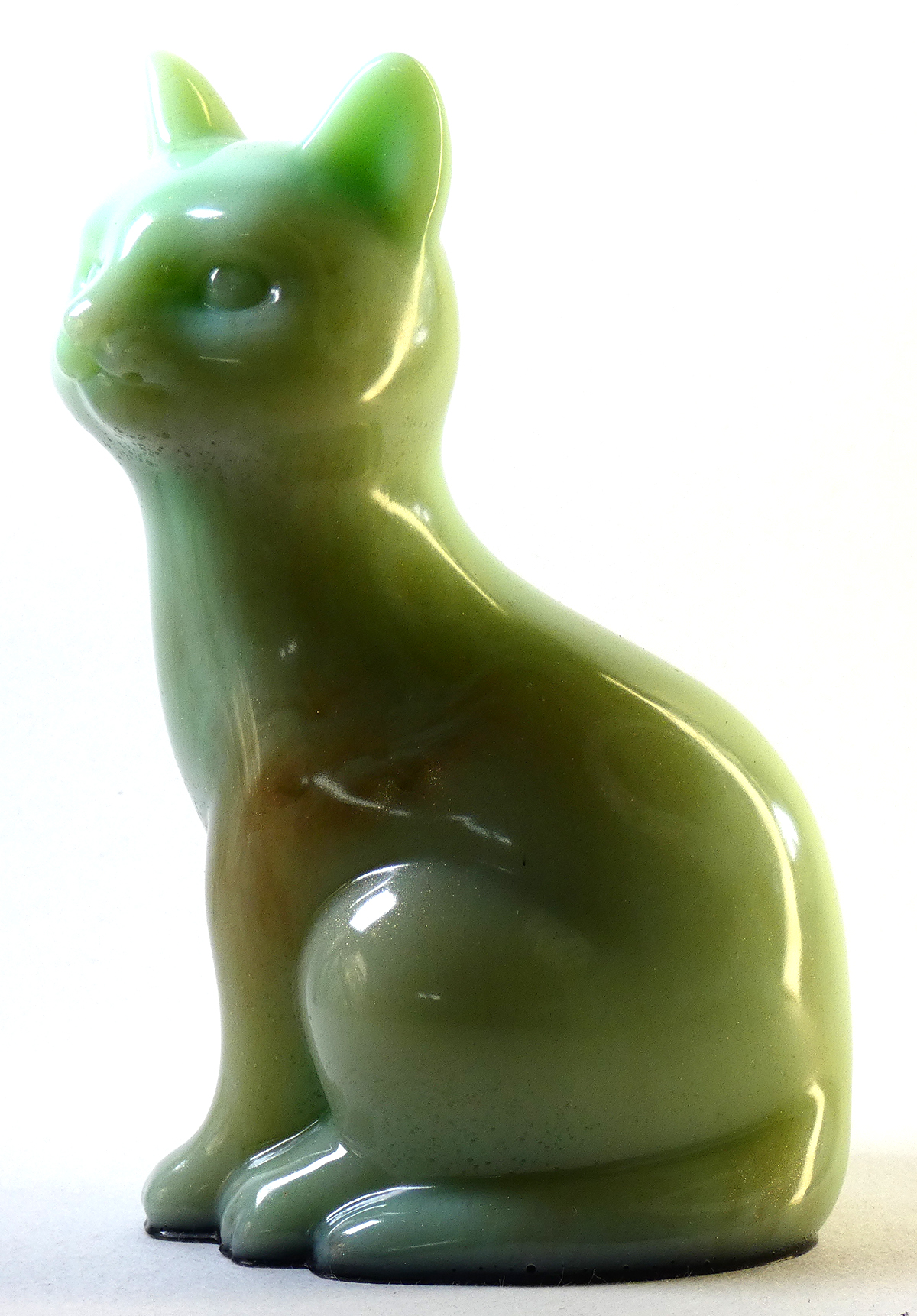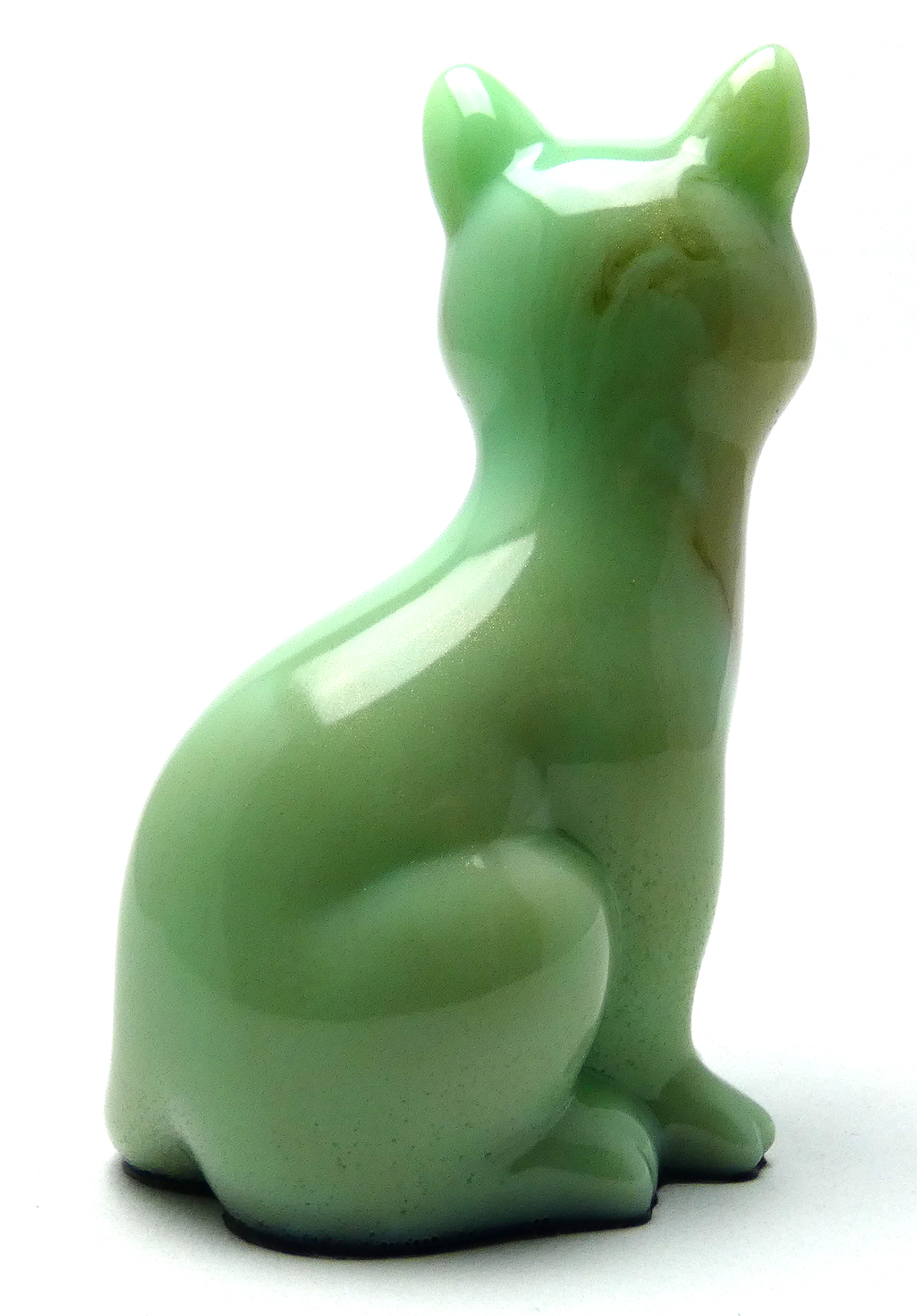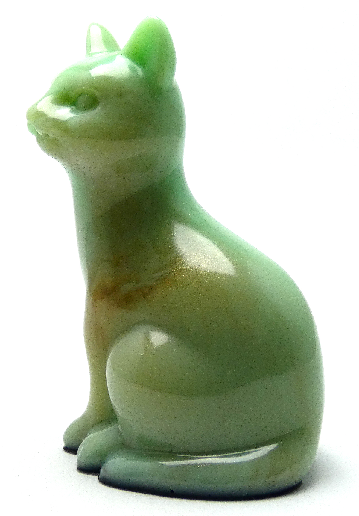 Kattenbeeldje van epoxy hars. De epoxy is gemengd met lichtgroen en bruine mica poeder. Hierdoor heeft het een jade met lichtbruine glinster effect gekregen. De onderkant is afgewerkt met zwarte epoxy.