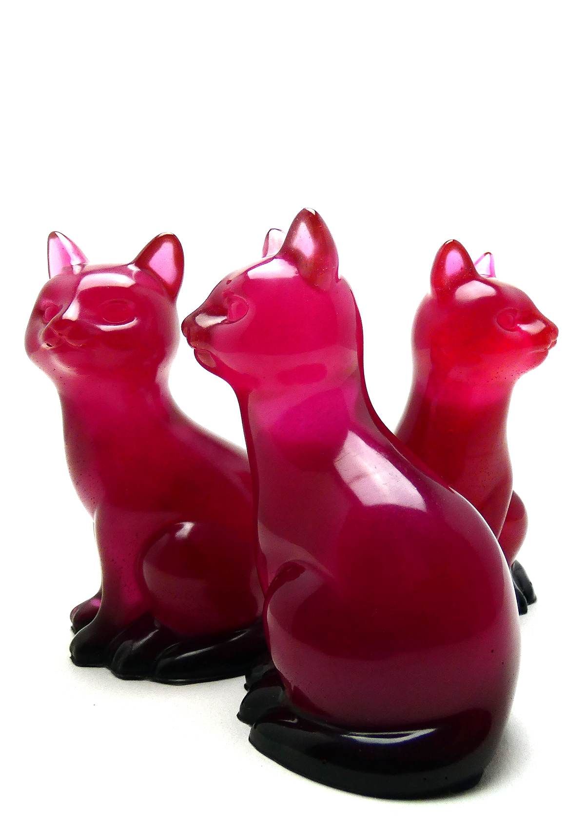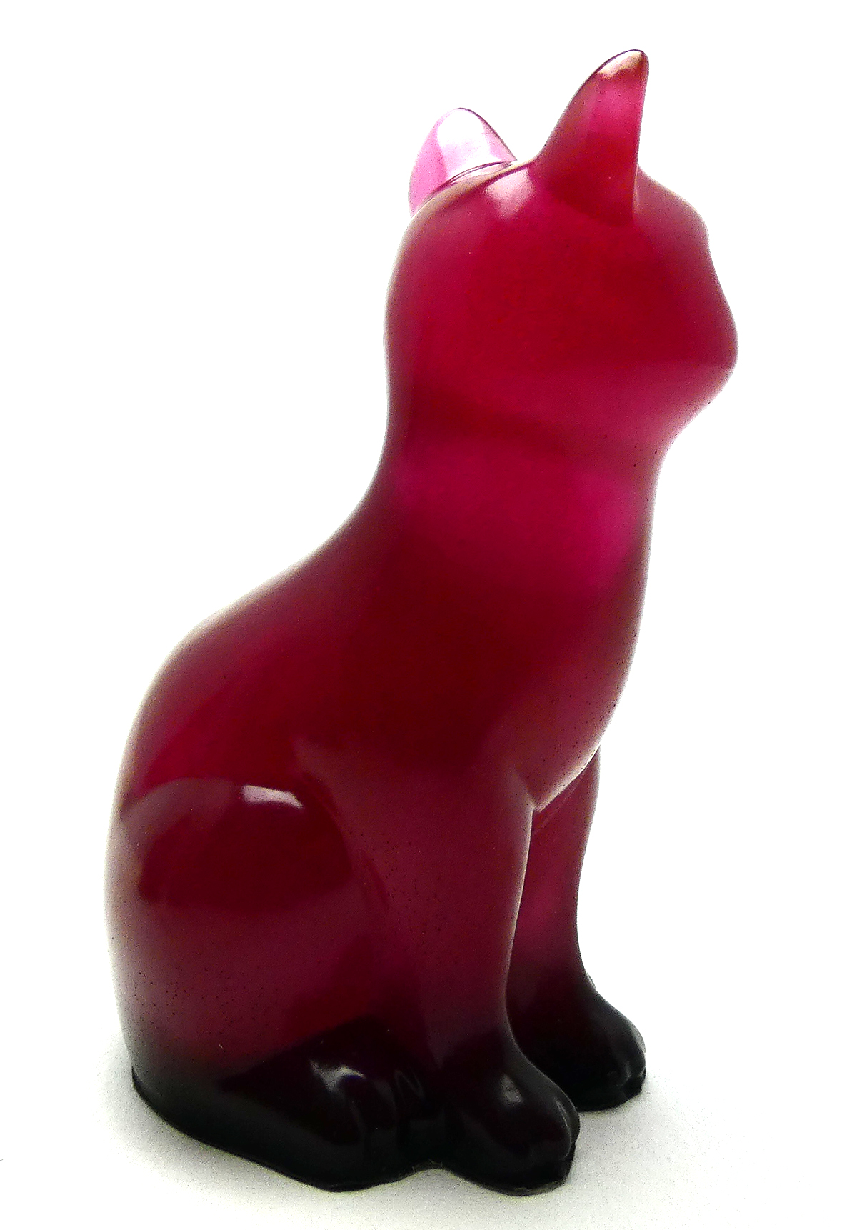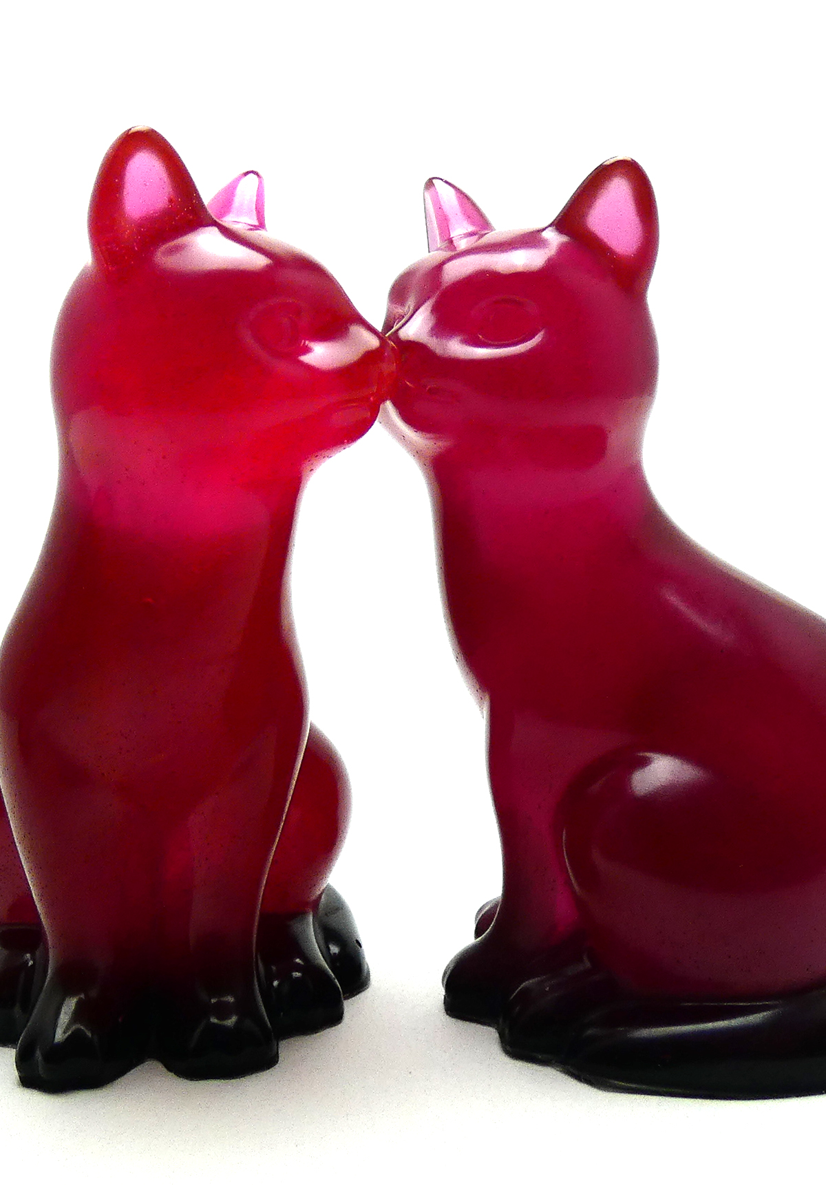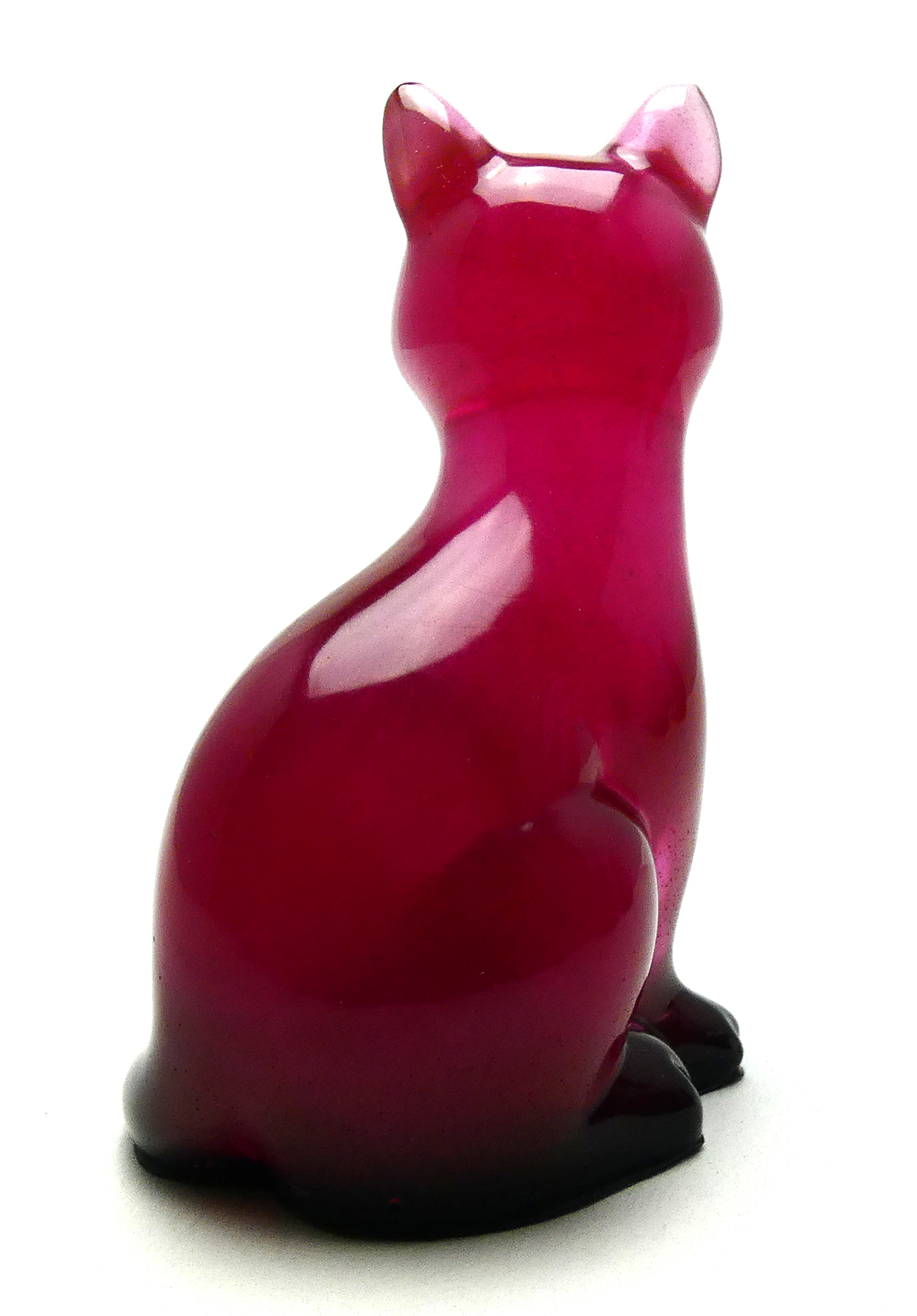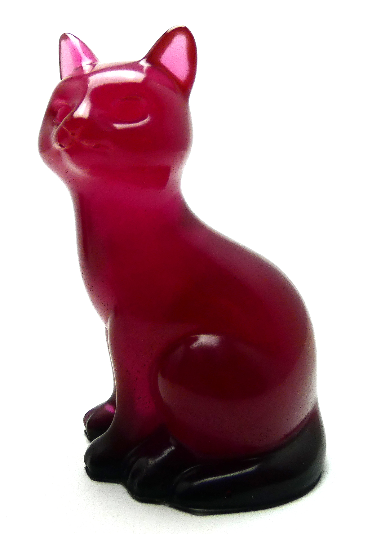 Kattenbeeldje van epoxy hars. De epoxy is gemengd met karmijnrode mica waardoor. Deze kattenbeeldjes hebben een diepe en licht glinsterende kleur effect. De onderkant is afgewerkt met zwarte epoxy.