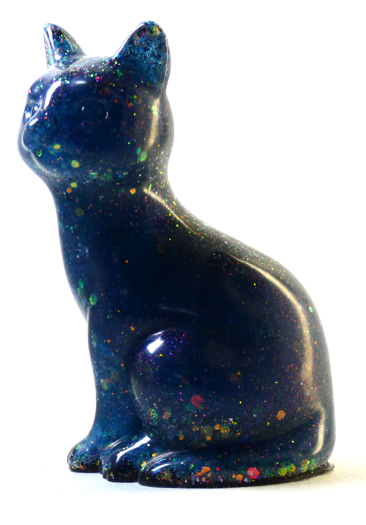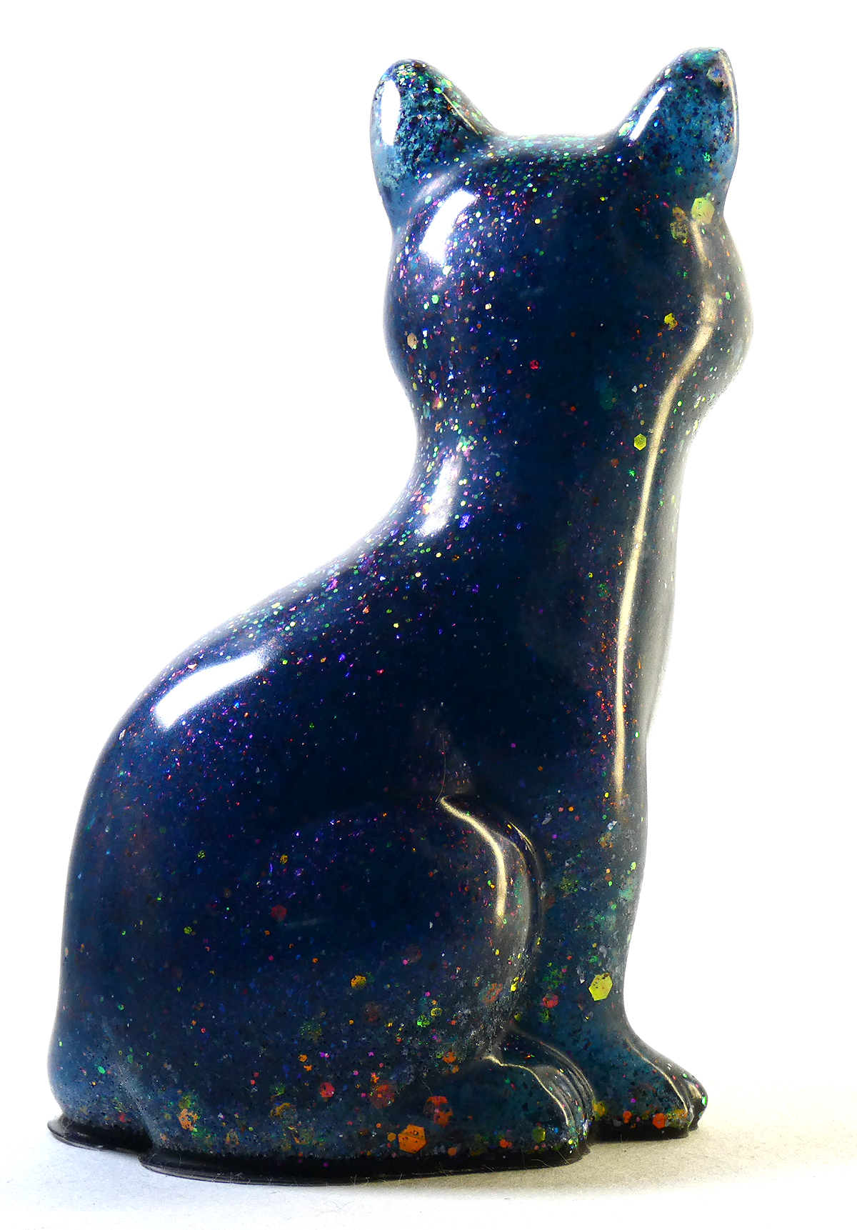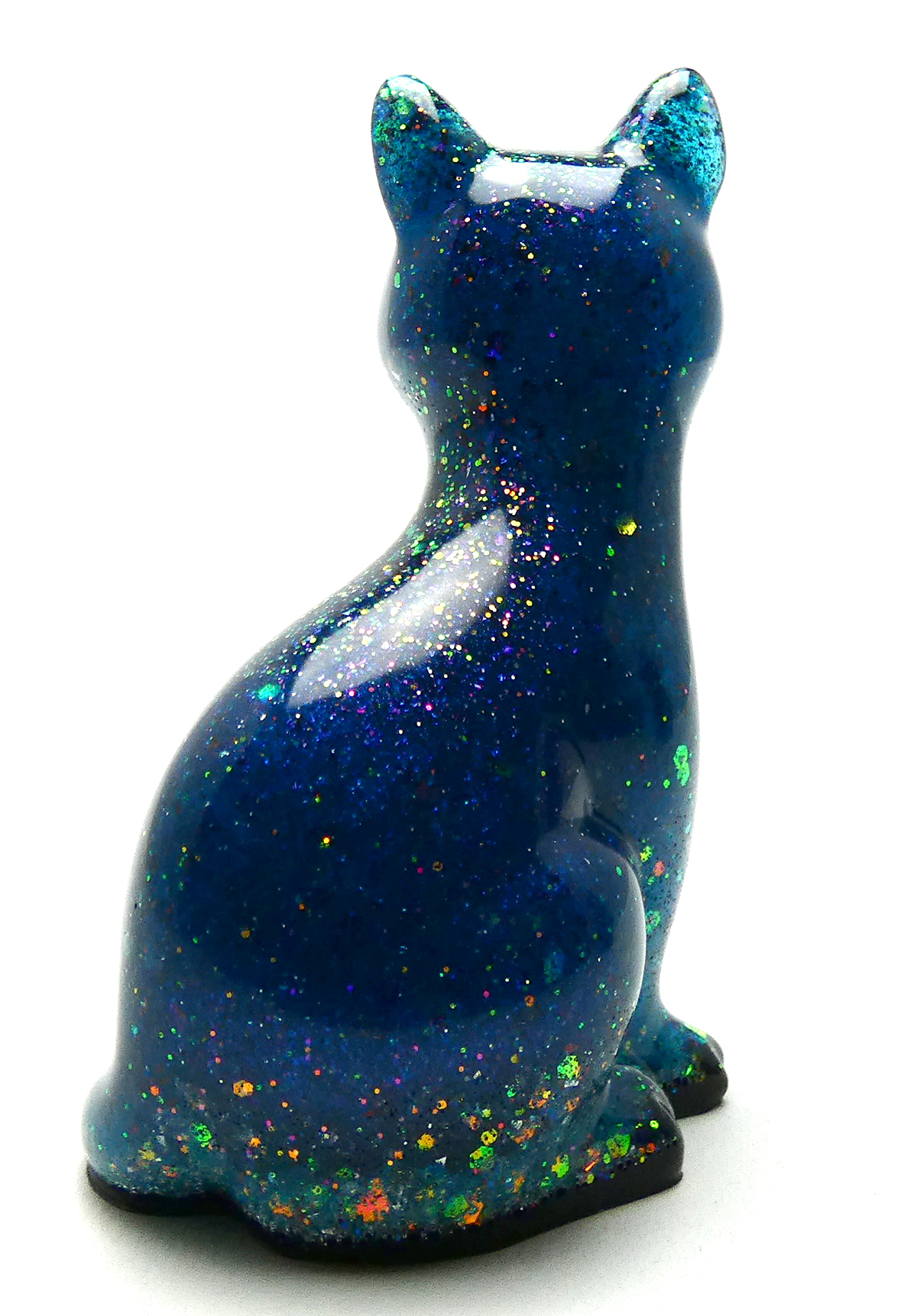 Kattenbeeldje van epoxy hars. De epoxy is gemengd met koningsblauwe glow in the dark en glitters. De koningsblauwe kleur is fluorescerend (glow in the dark) als je het beeldje in het donker plaatst, dan veranderd het blauw in een heldere kleur. Om dit effect te zien moet het beeldje een tijdje in het licht staan en dan kan je het fluorescerend effect zien als het interieur donker is. De onderkant is afgewerkt met zwarte epoxy.