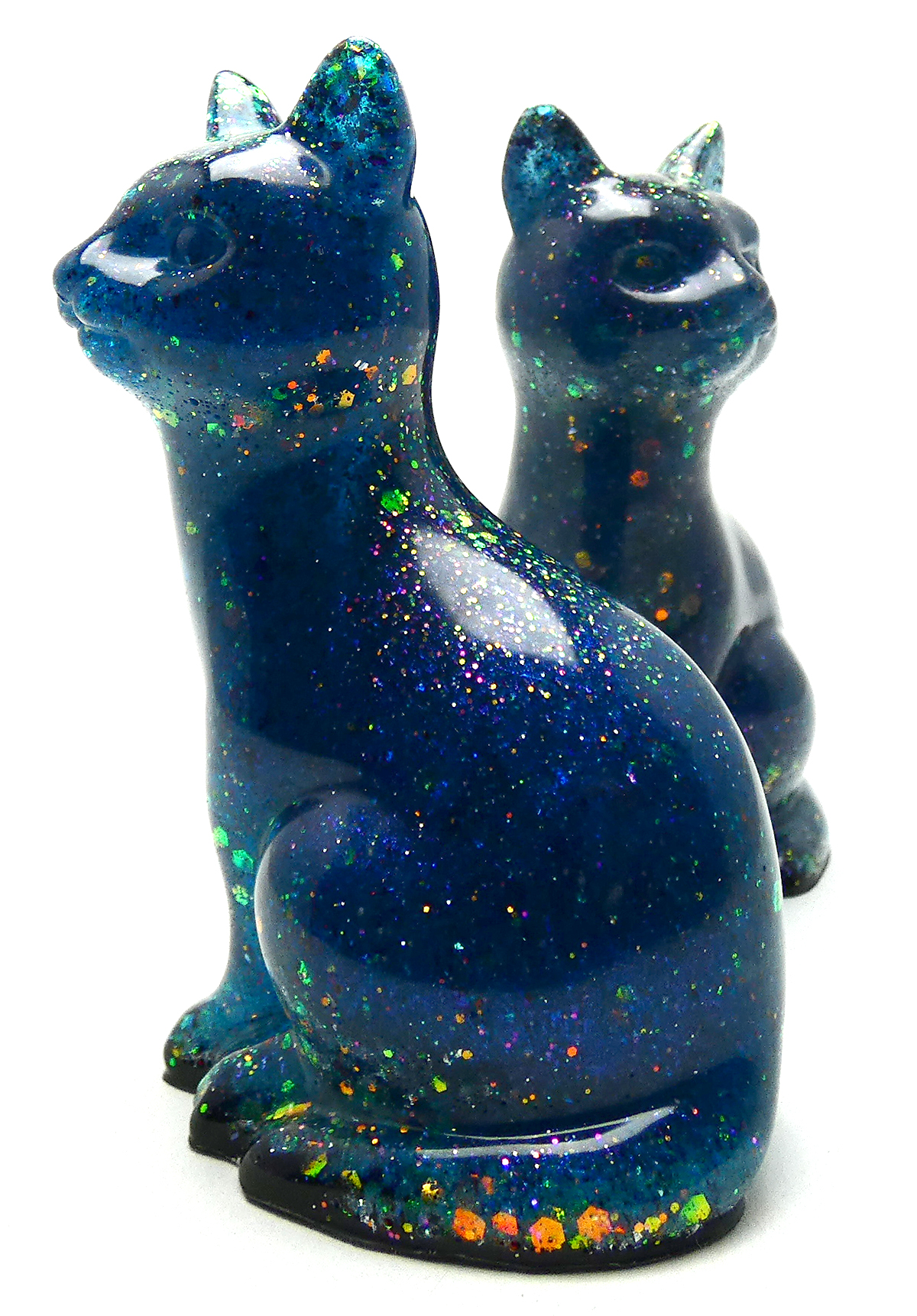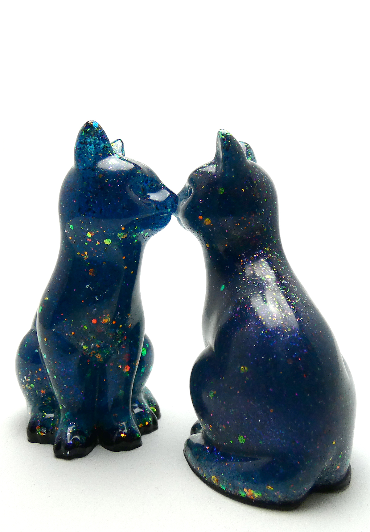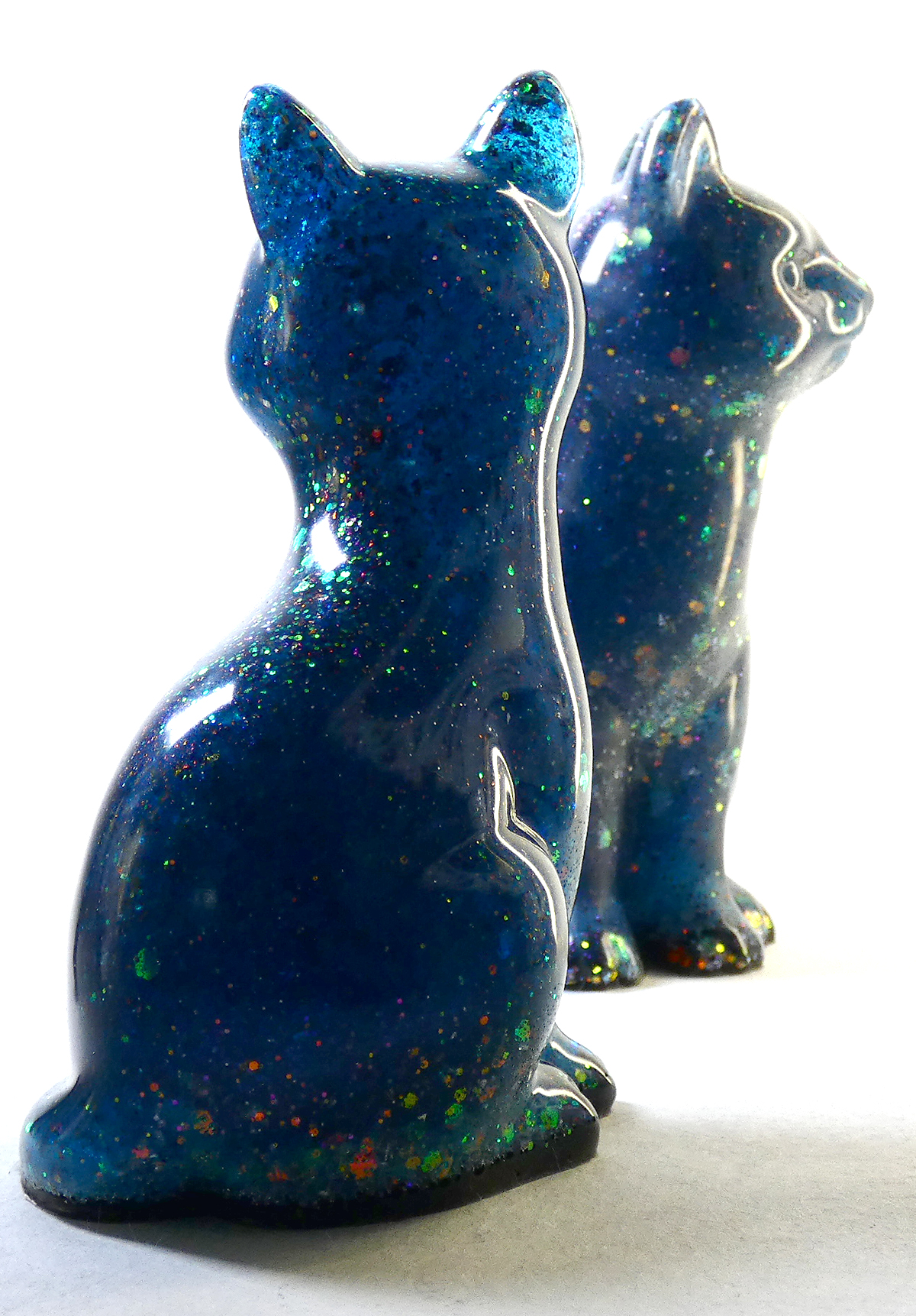 Kattenbeeldje van epoxy hars. De epoxy is gemengd met koningsblauwe glow in the dark en glitters. De koningsblauwe kleur is fluorescerend (glow in the dark) als je het beeldje in het donker plaatst, dan veranderd het blauw in een heldere kleur. Om dit effect te zien moet het beeldje een tijdje in het licht staan en dan kan je het fluorescerend effect zien als het interieur donker is. De onderkant is afgewerkt met zwarte epoxy.