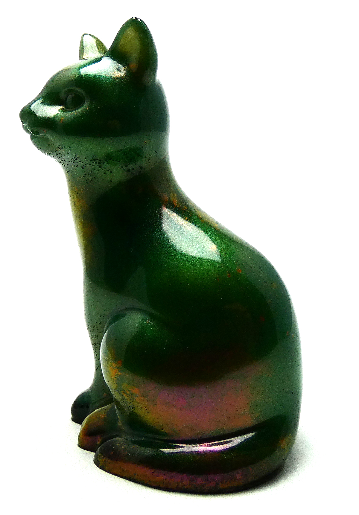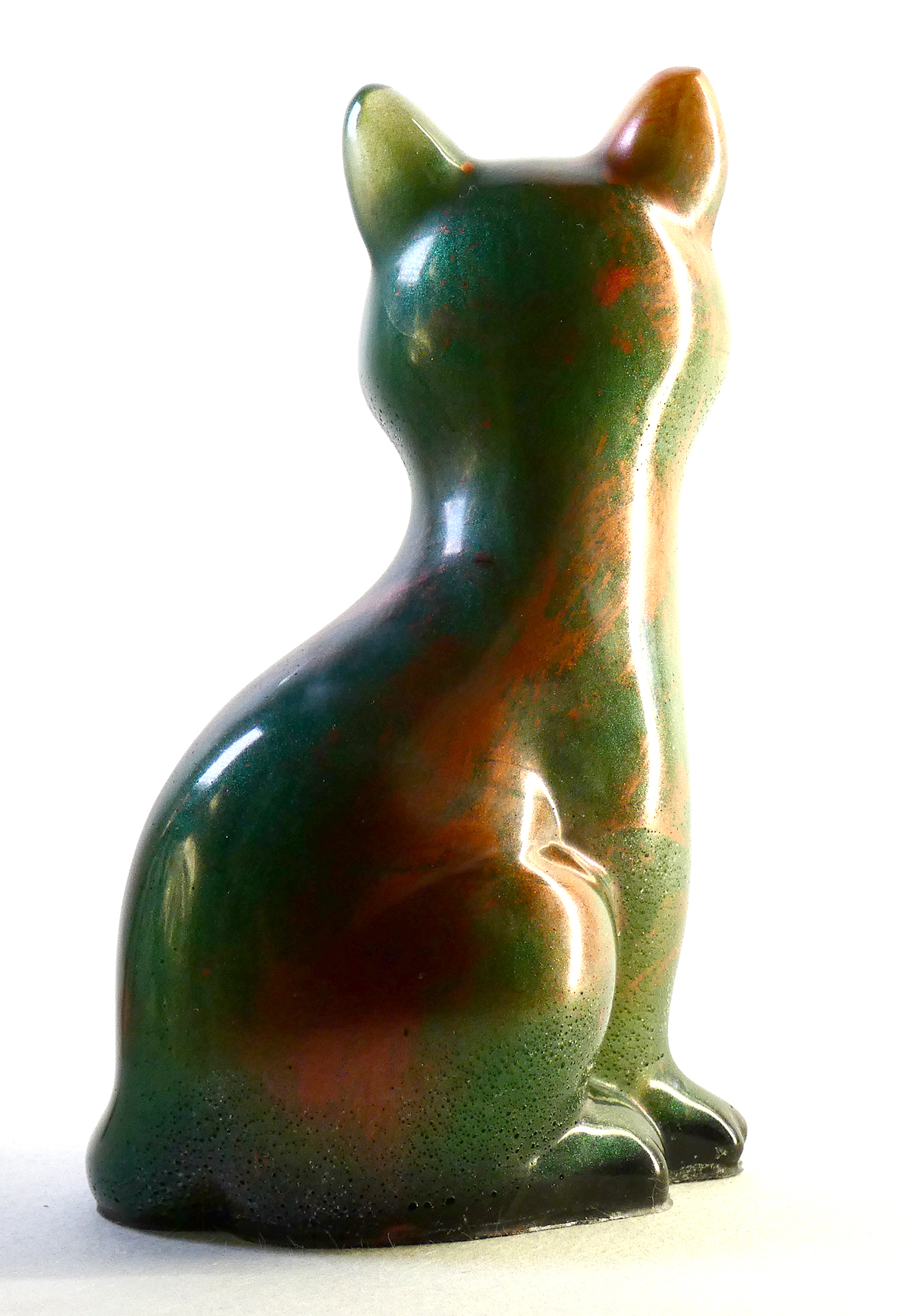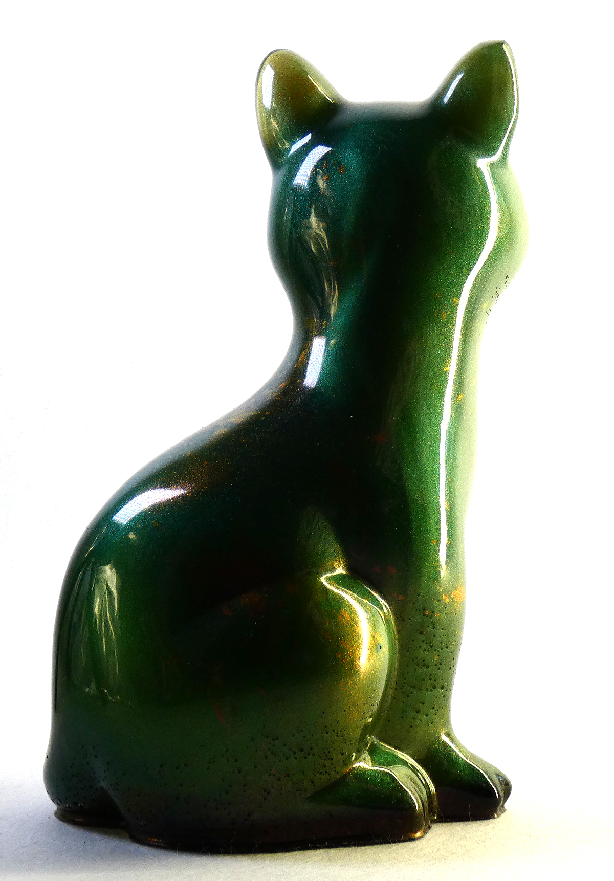 Kattenbeeldje van epoxy hars. De epoxy is gemengd met donkergroene mica poeder en koperrood. Dit geeft deze kat een soort natuurlijk verweerd effect met een lichte glinstering