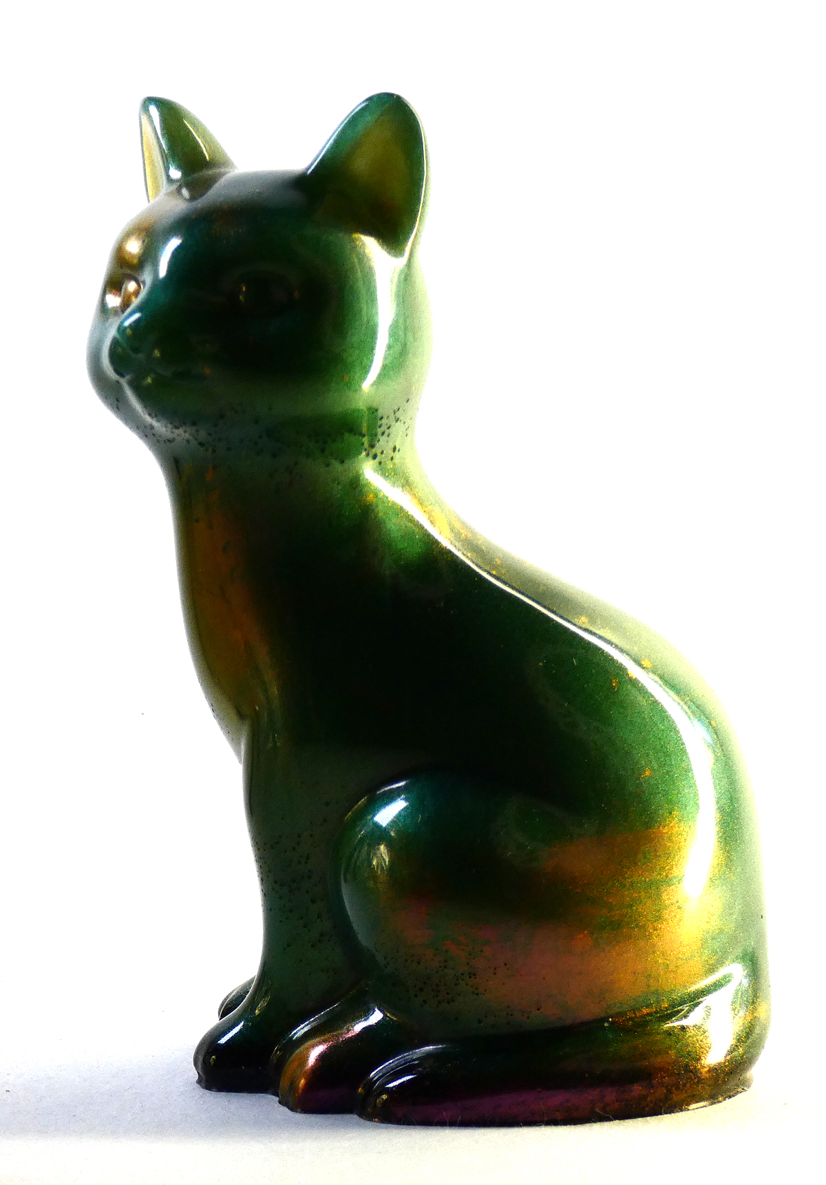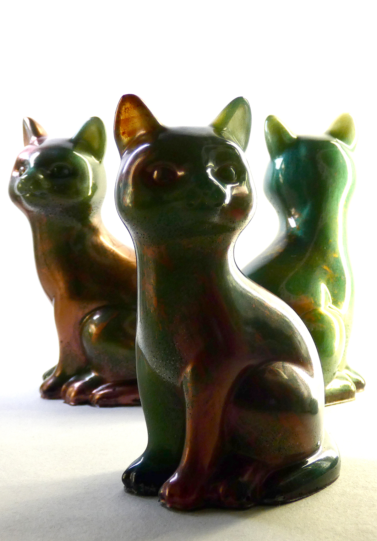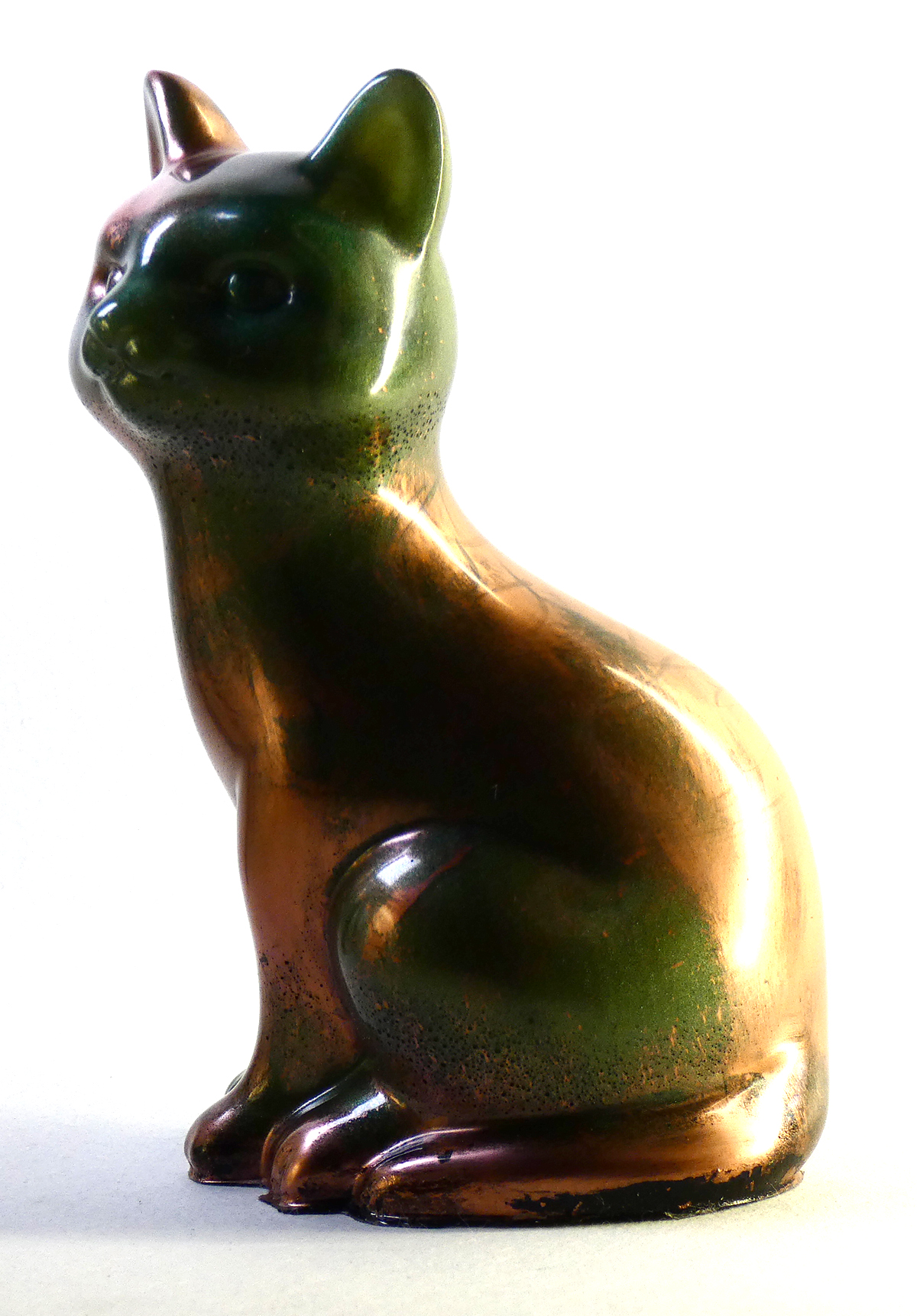 Kattenbeeldje van epoxy hars. De epoxy is gemengd met donkergroene mica poeder en koperrood. Dit geeft deze kat een soort natuurlijk verweerd effect met een lichte glinstering