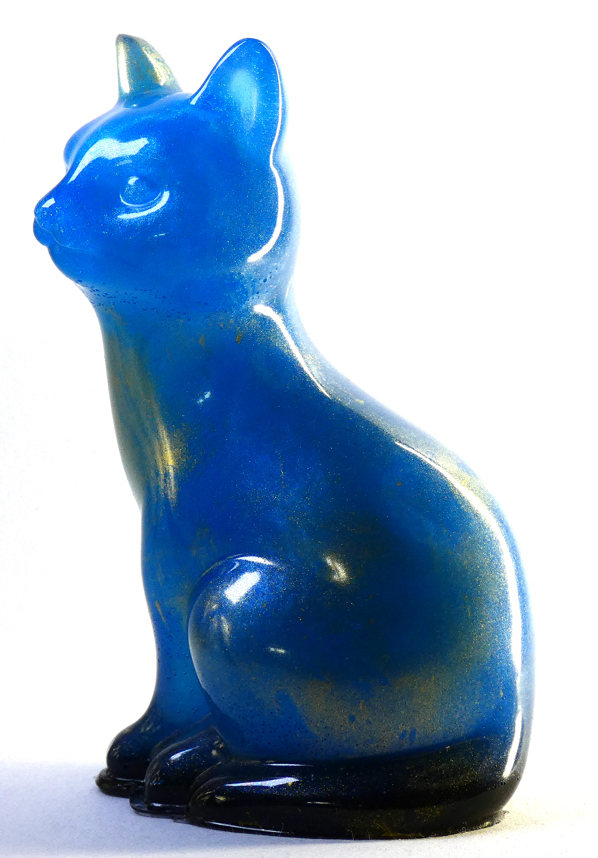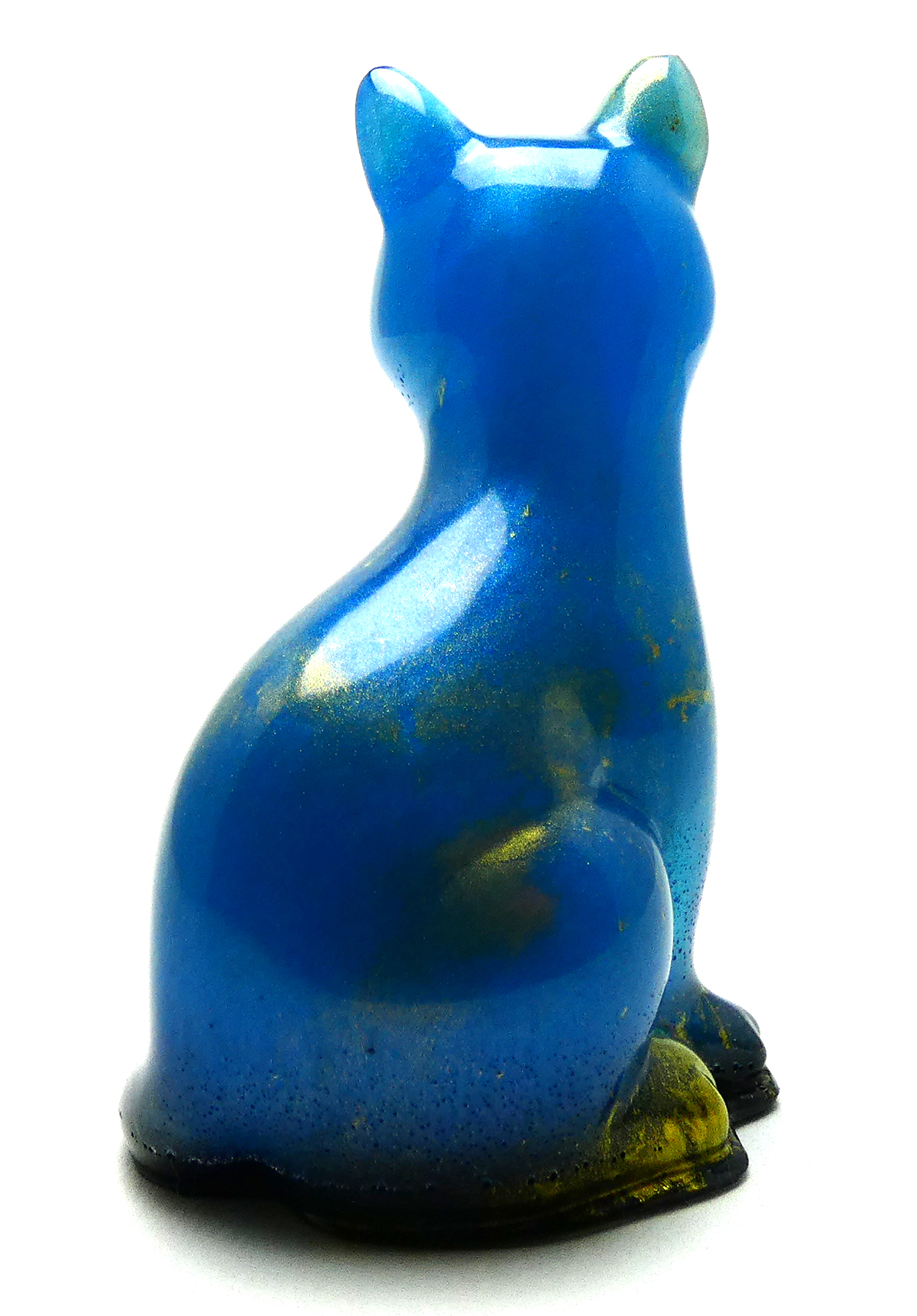 Kattenbeeldje van epoxy hars. De epoxy is gemengd met een lichtblauwe kleur mica poeder en goud pigment. De onderkant is afgewerkt met zwarte epoxy.