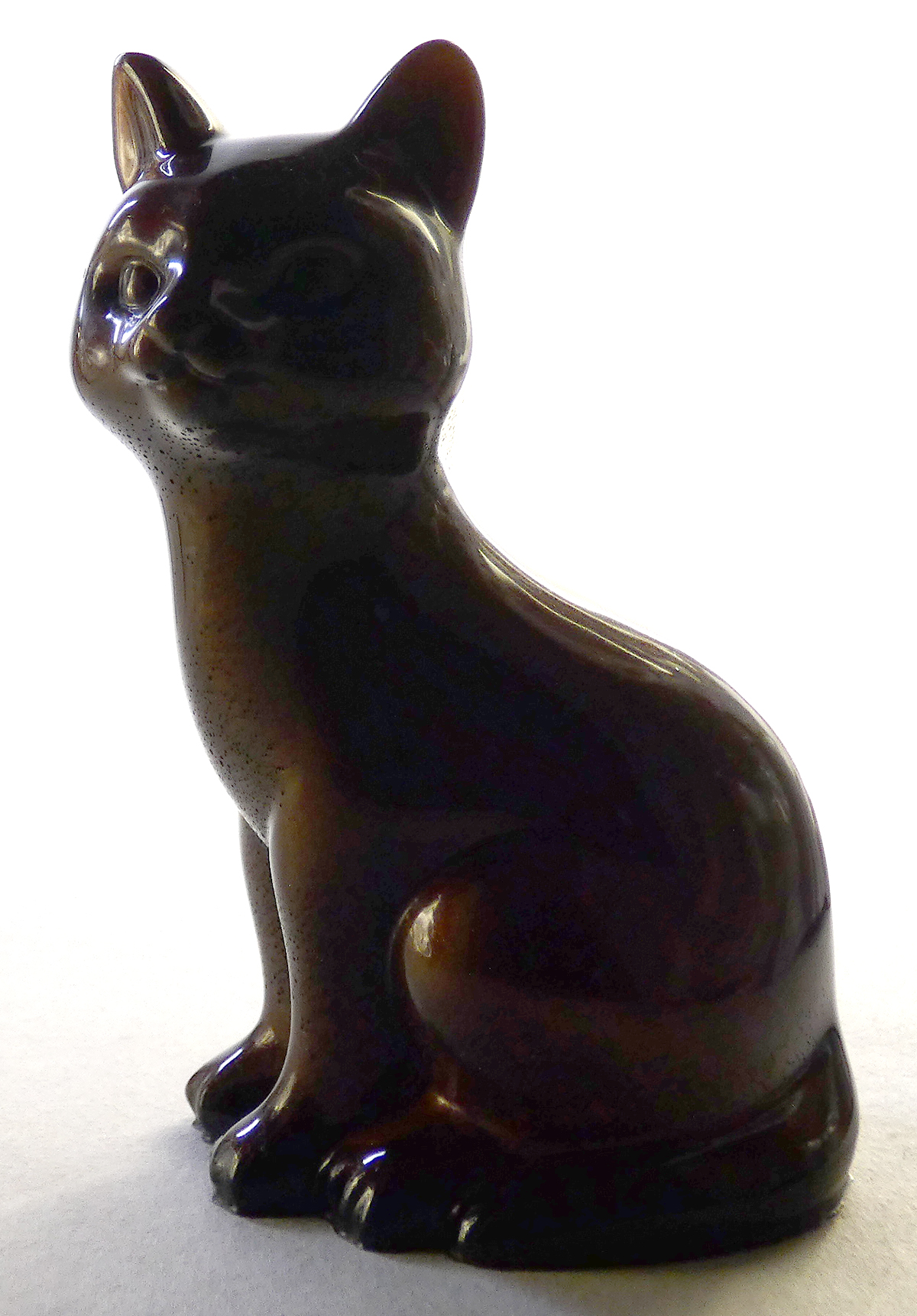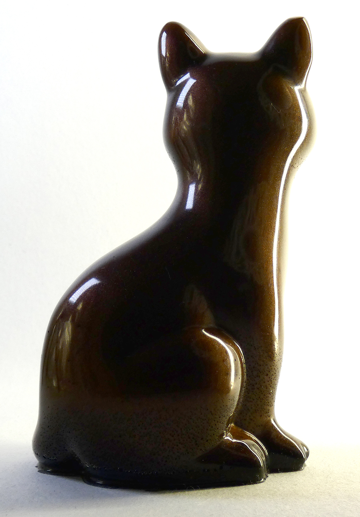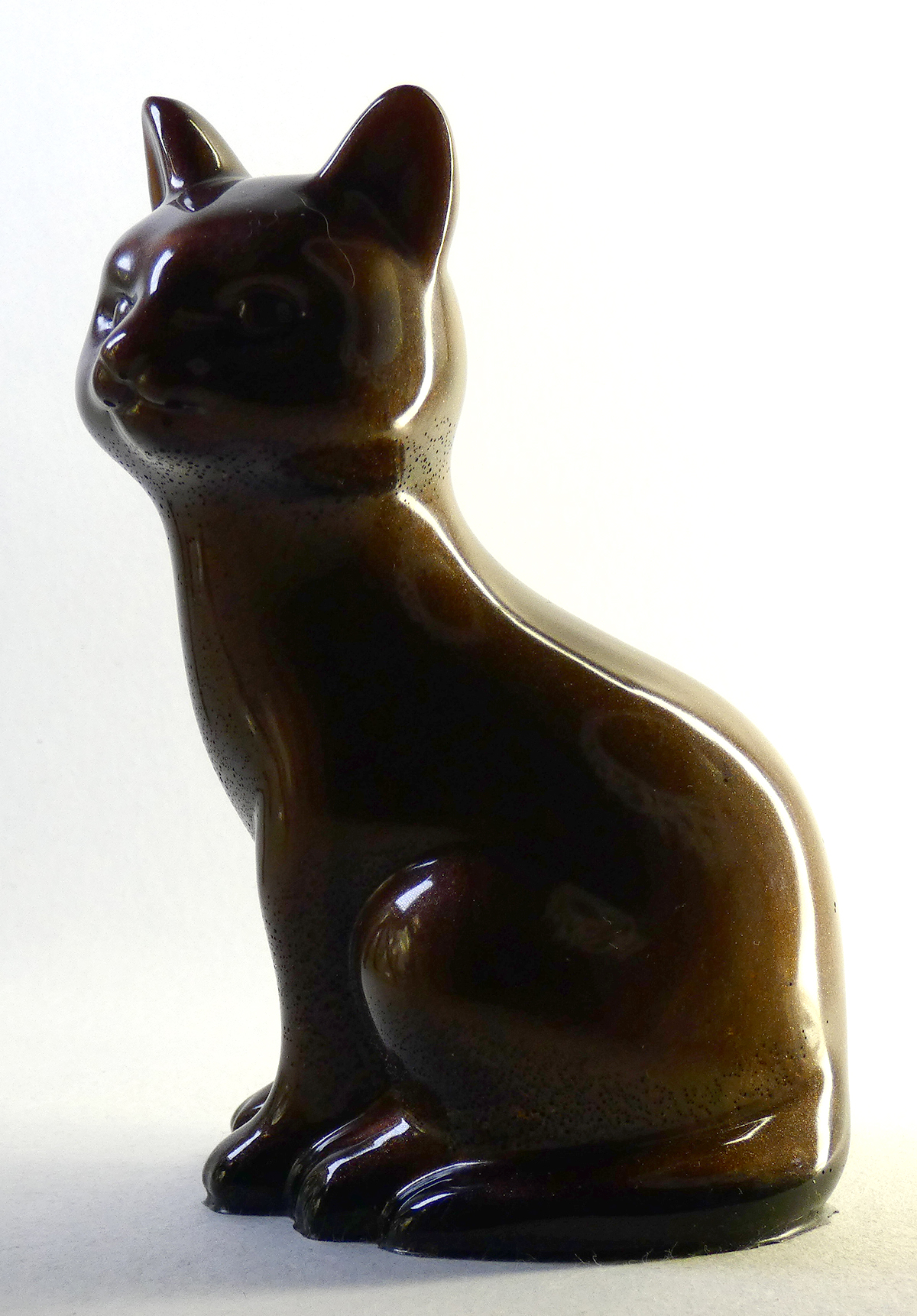 Kattenbeeldje van epoxy hars. De epoxy is gemengd met mokka bruine mica poeder. De onderkant is afgewerkt met zwarte epoxy.