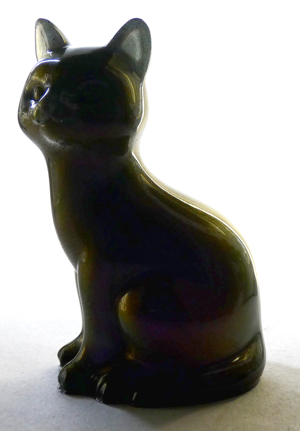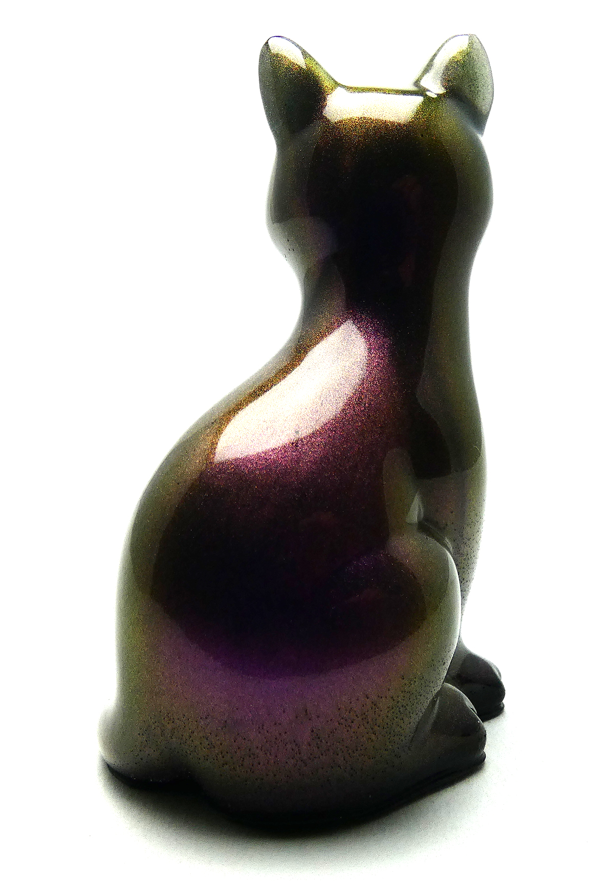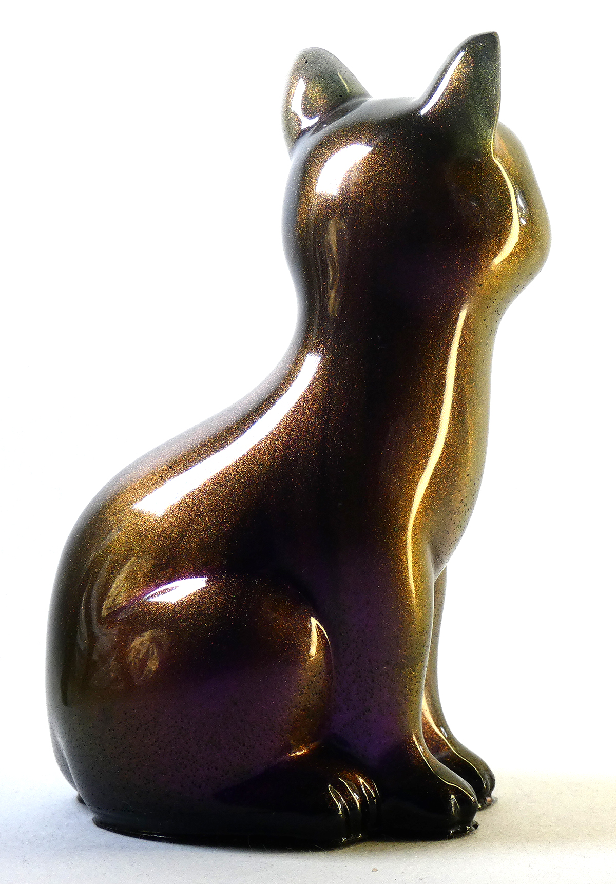 Kattenbeeldje van epoxy hars. De epoxy is gemengd met paars koper mica poeder. Afhankelijk van hoe het licht op deze kat schijnt en de kijkhoek, verschuiven de kleuren paars en koper door het glinsterende interference mica poeder. De onderkant is afgewerkt met zwarte epoxy.