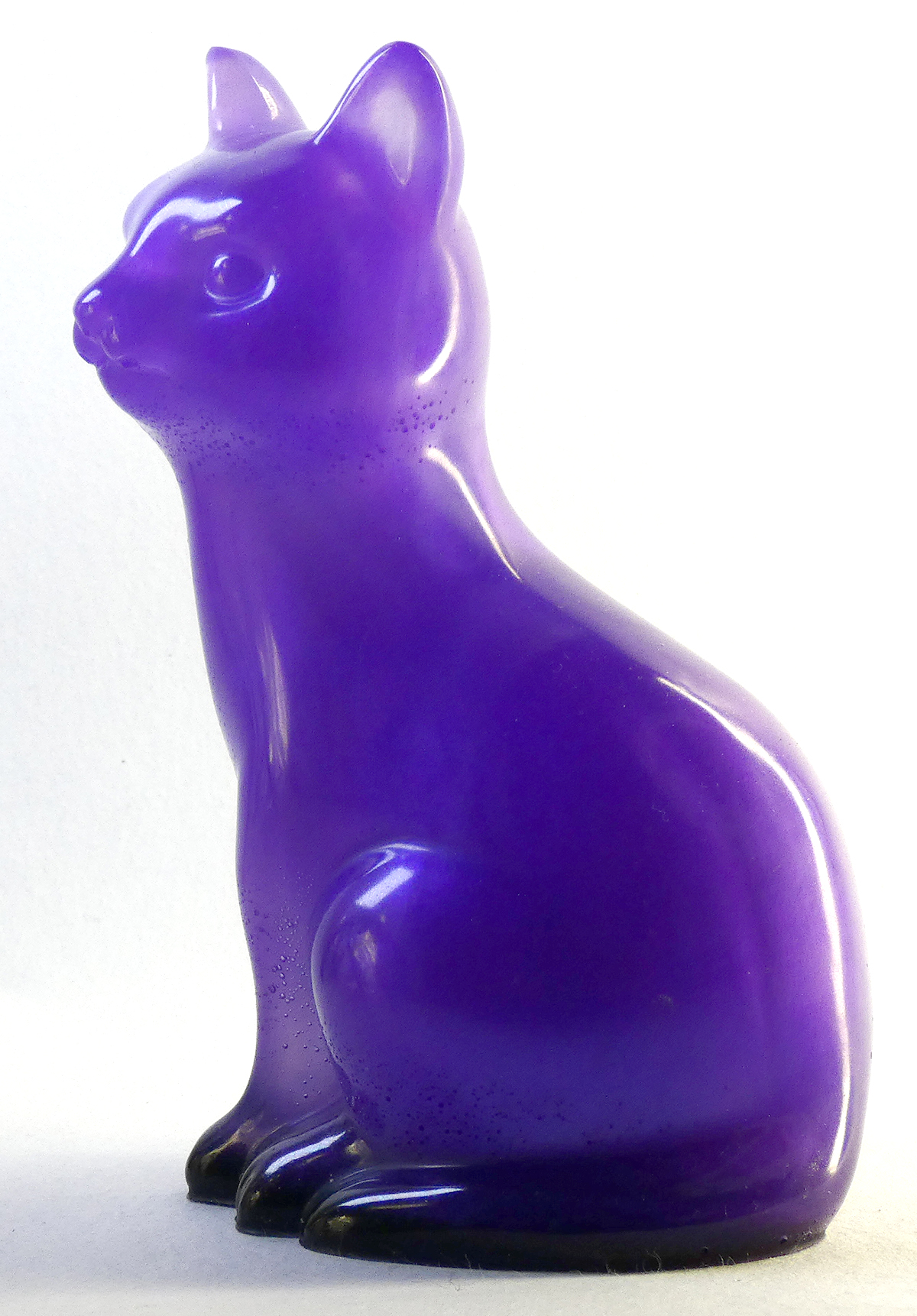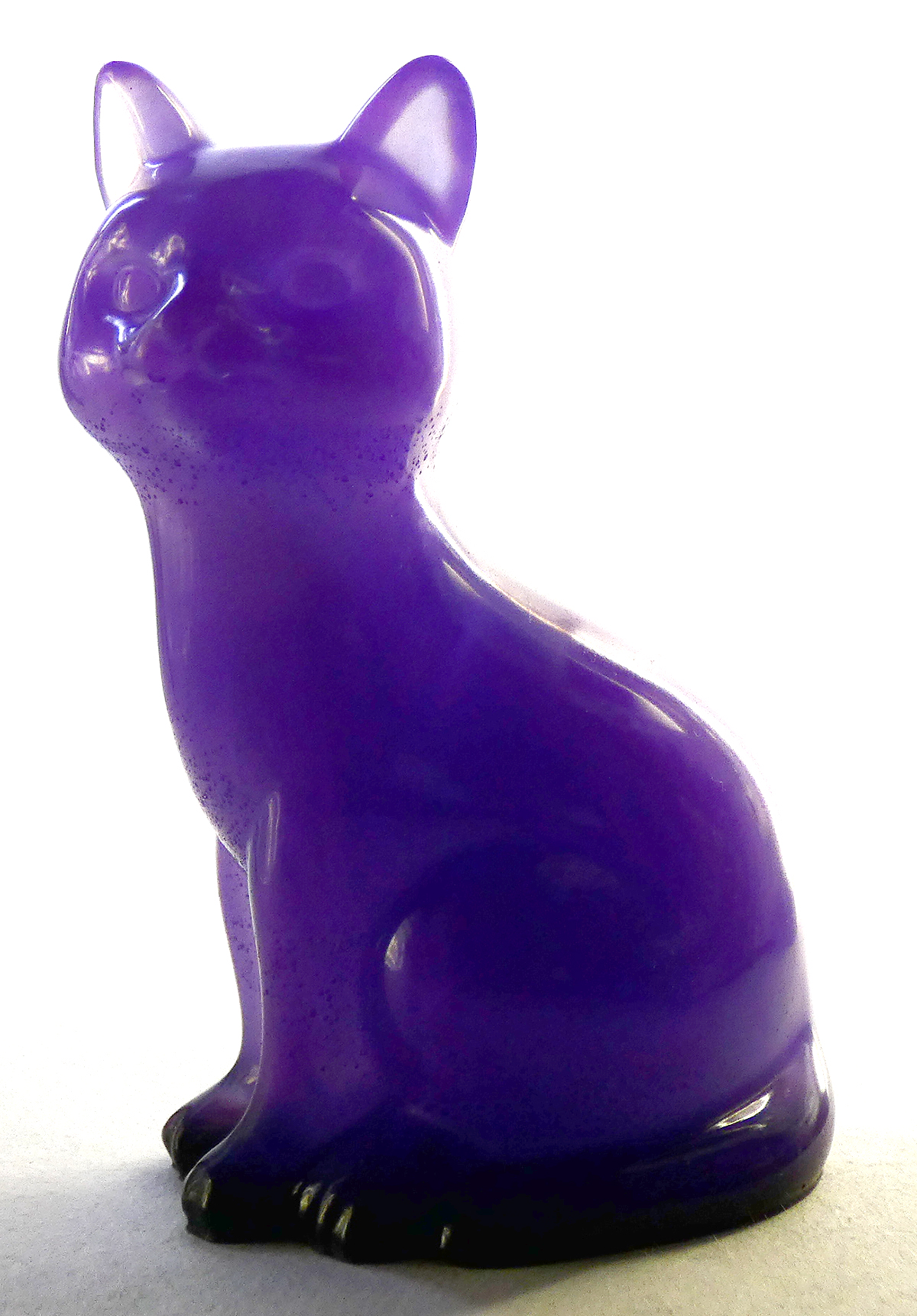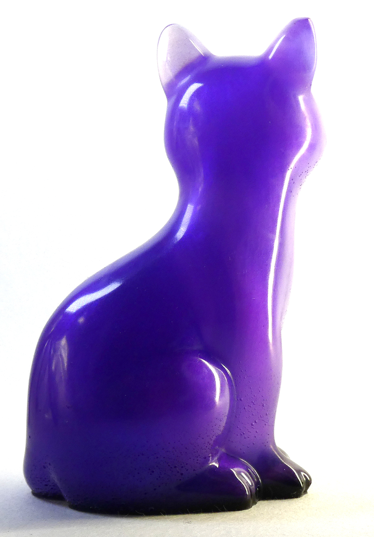 Kattenbeeldje van epoxy hars. De epoxy is gemengd met violet paarse mica wat zorgt voor een licht glinsterend effect. De onderkant is afgewerkt met zwarte epoxy.