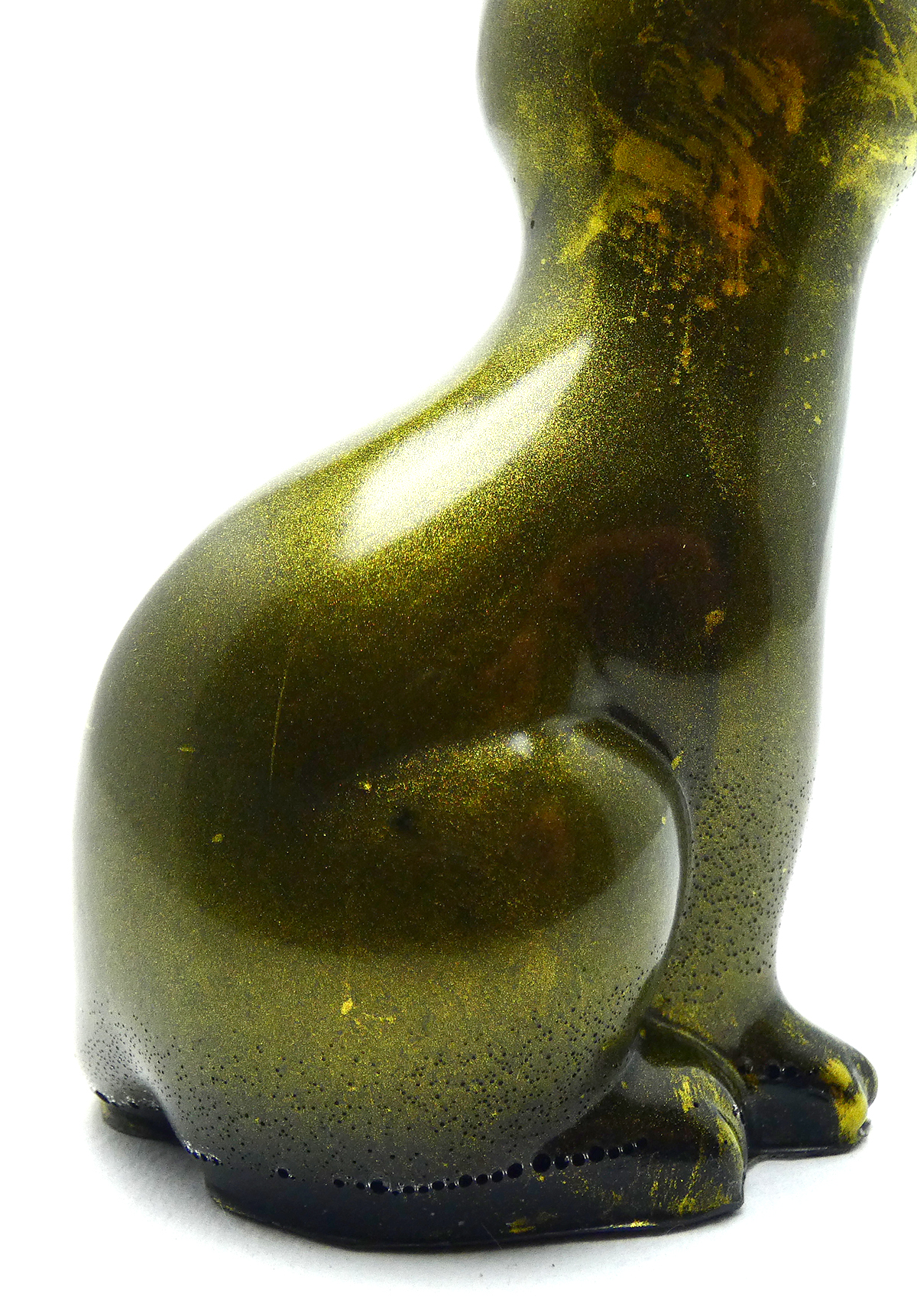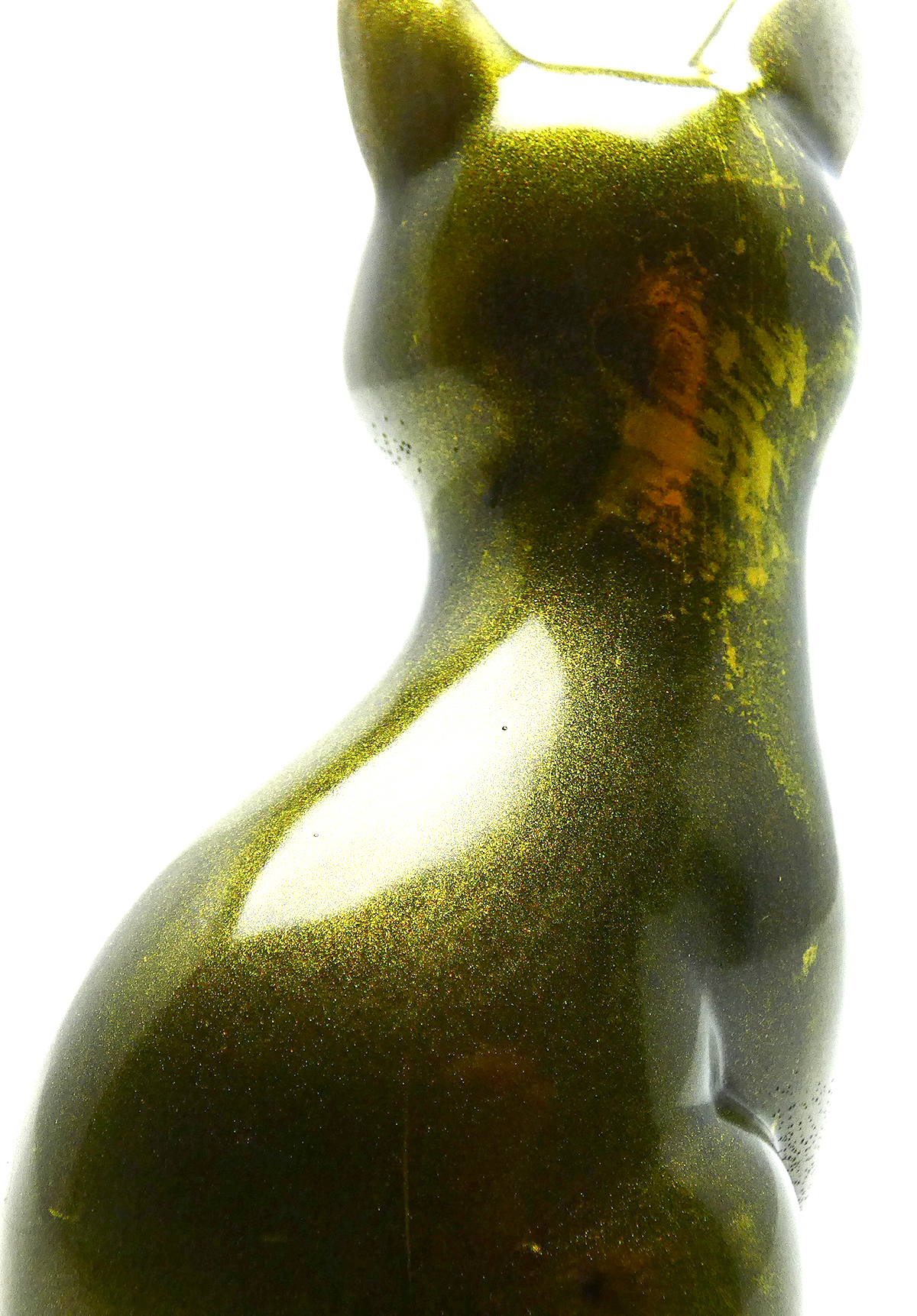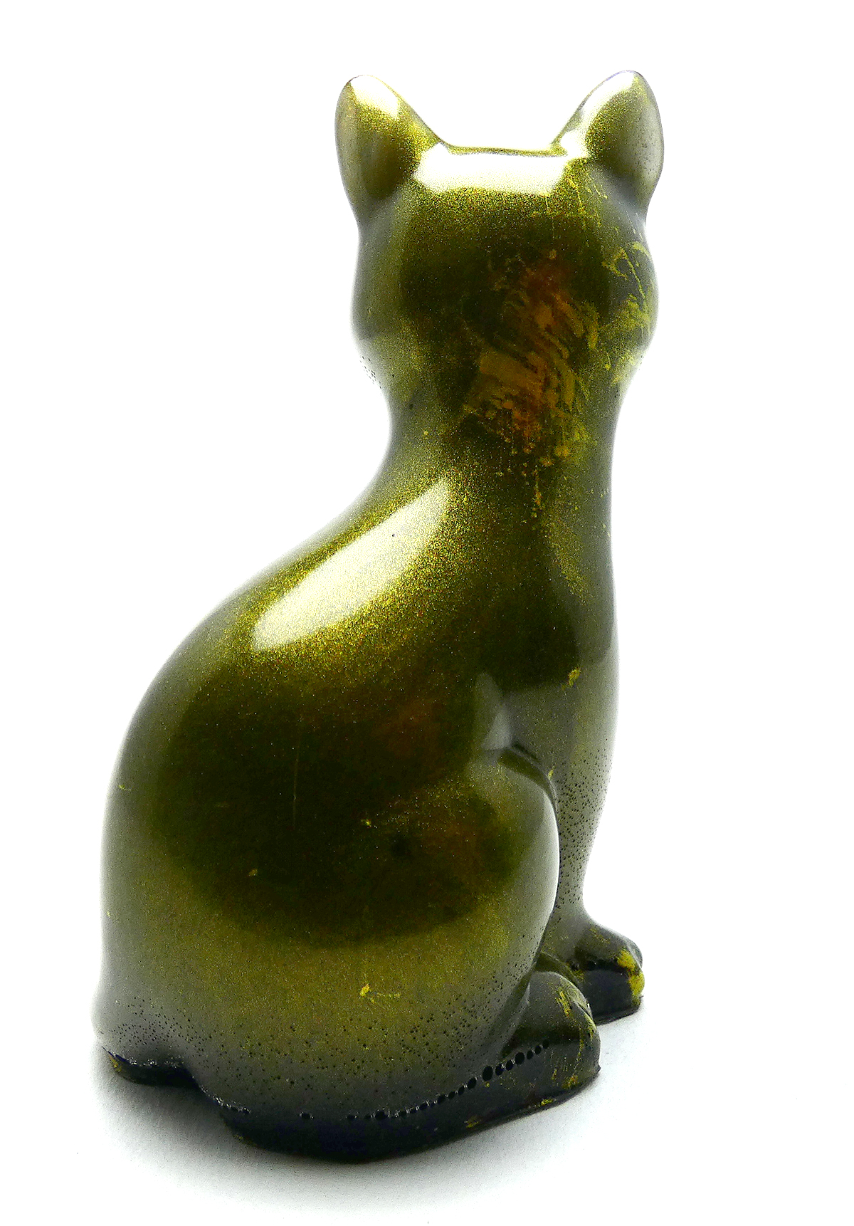 Kattenbeeldje van epoxy hars. De epoxy is gemengd met mica goudpoeder en zwart. De onderkant is afgewerkt met zwarte epoxy.