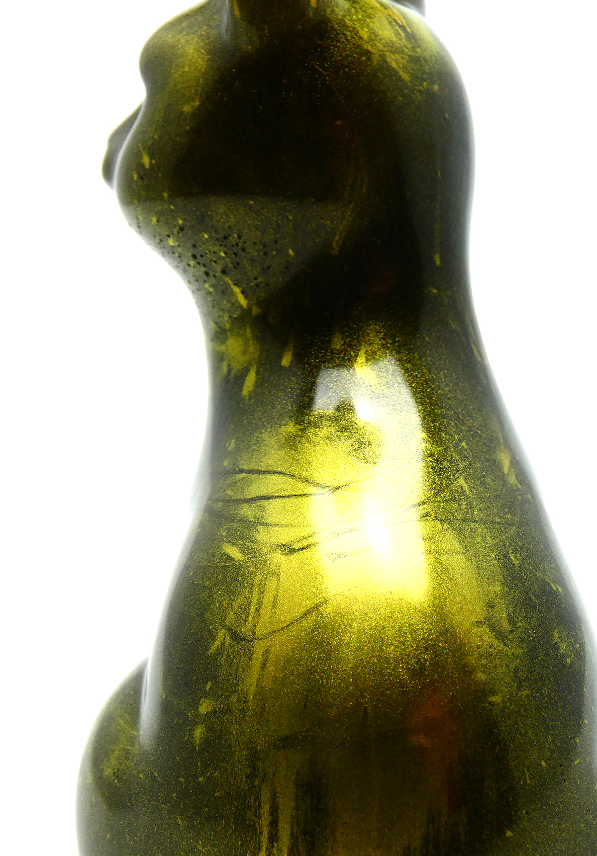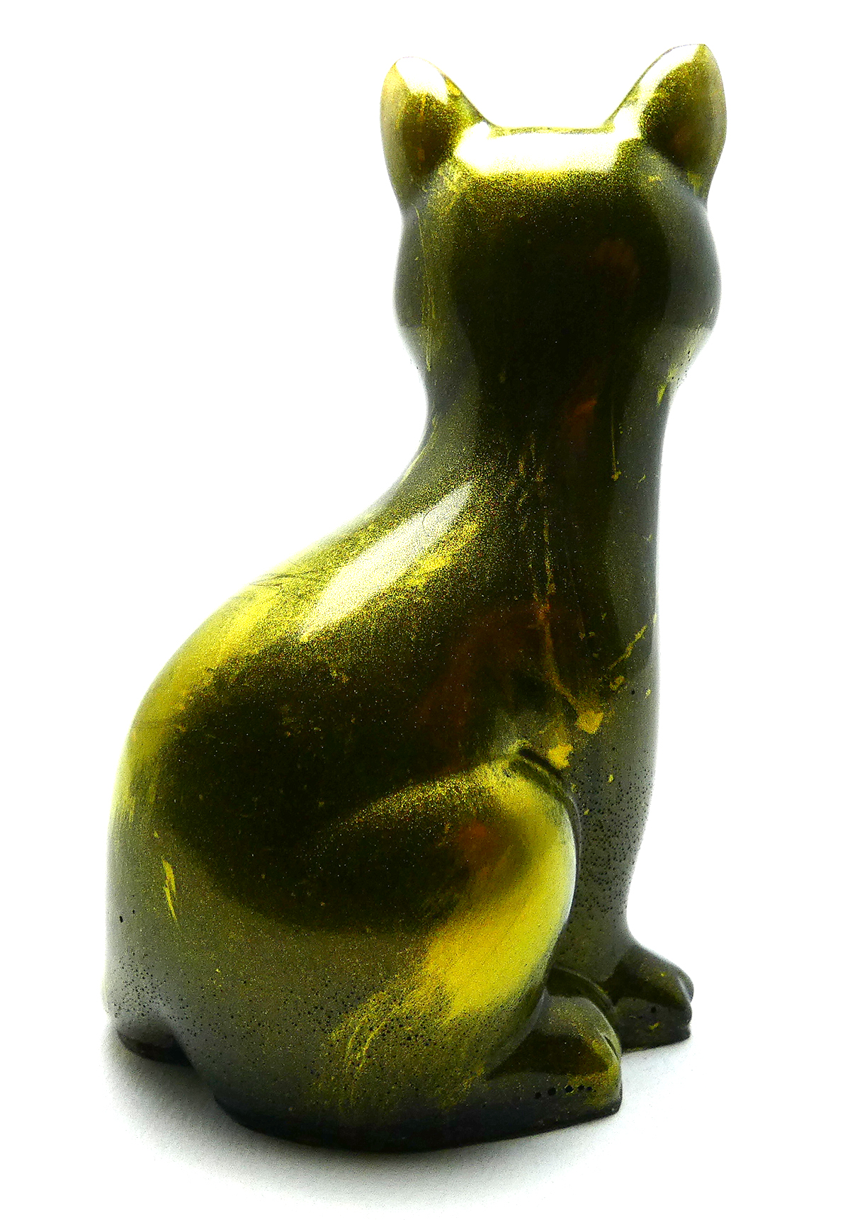 Kattenbeeldje van epoxy hars. De epoxy is gemengd met mica goudpoeder en zwart. De onderkant is afgewerkt met zwarte epoxy.