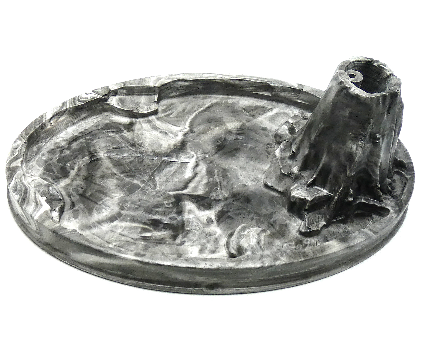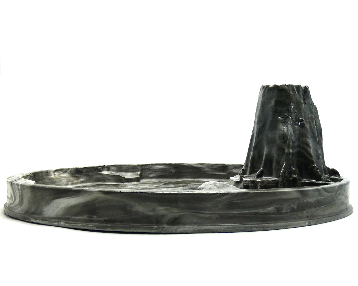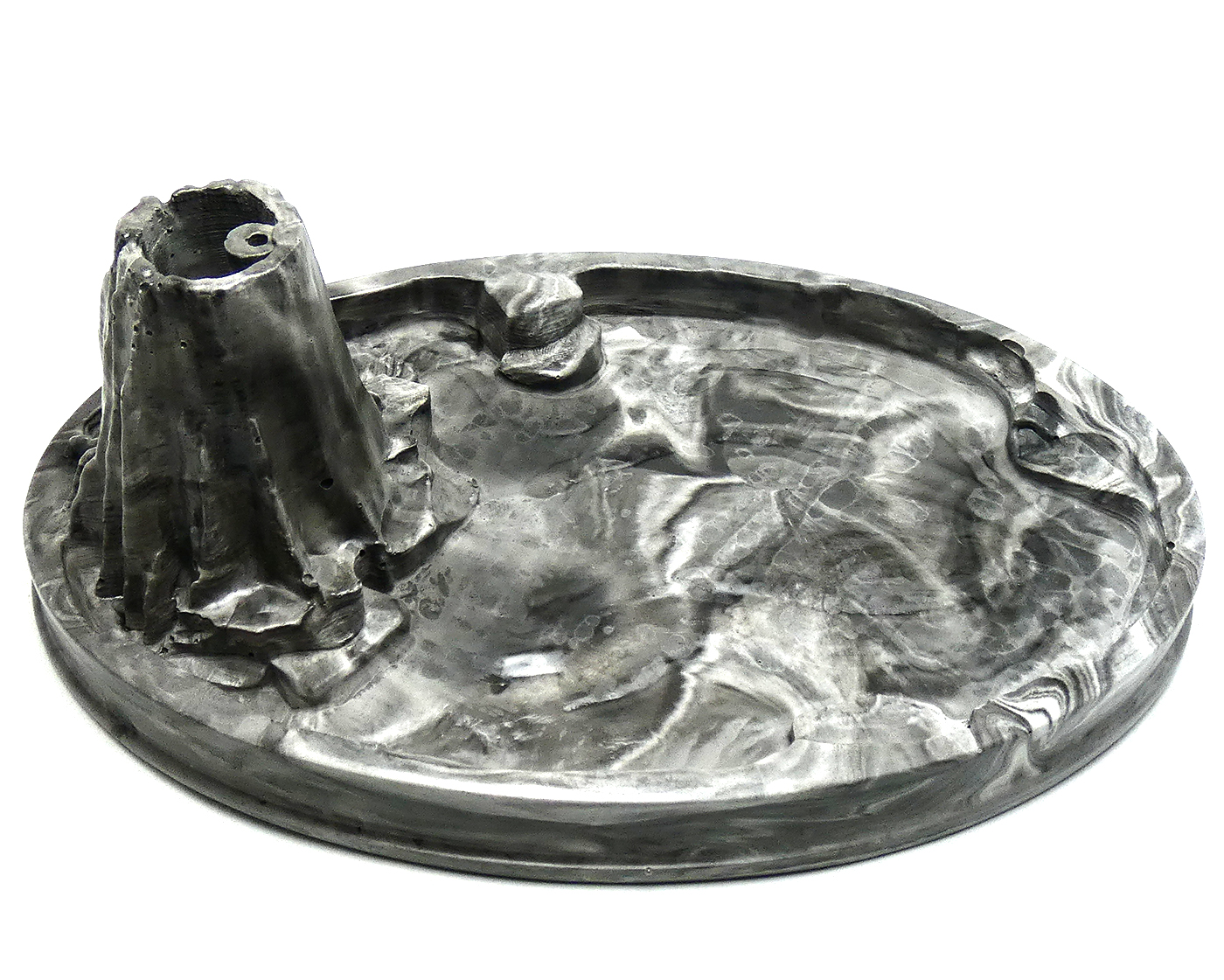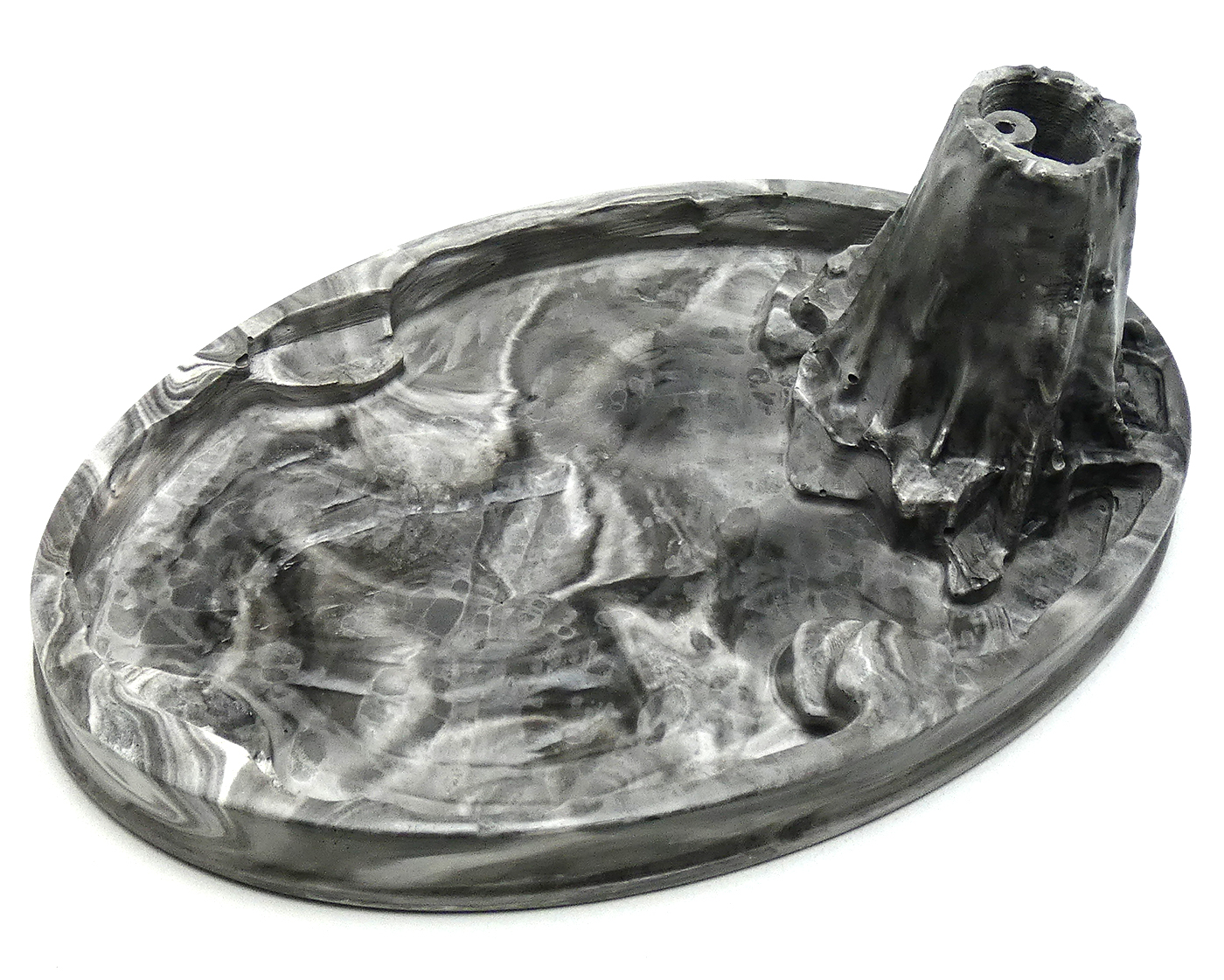 Gemaakt van witte eco resin met zwarte pigment. Afgewerkt met twee lagen glanslak. De Volcano wierookhouder voelt als een stenen object, is robuust en weegt 875 gram.