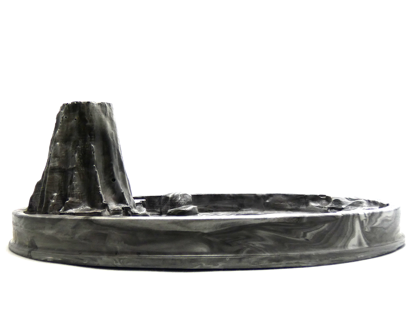 Wierook houder in de vorm van een vulkaan met een open vlakte waar het as van de wierook op kan vallen. Er kan een wierookstokje (om aan te steken) in het kleine gat boven in de vulkaan worden geplaatst en eventueel kunnen de andere stokjes in de grotere opening worden bewaard.